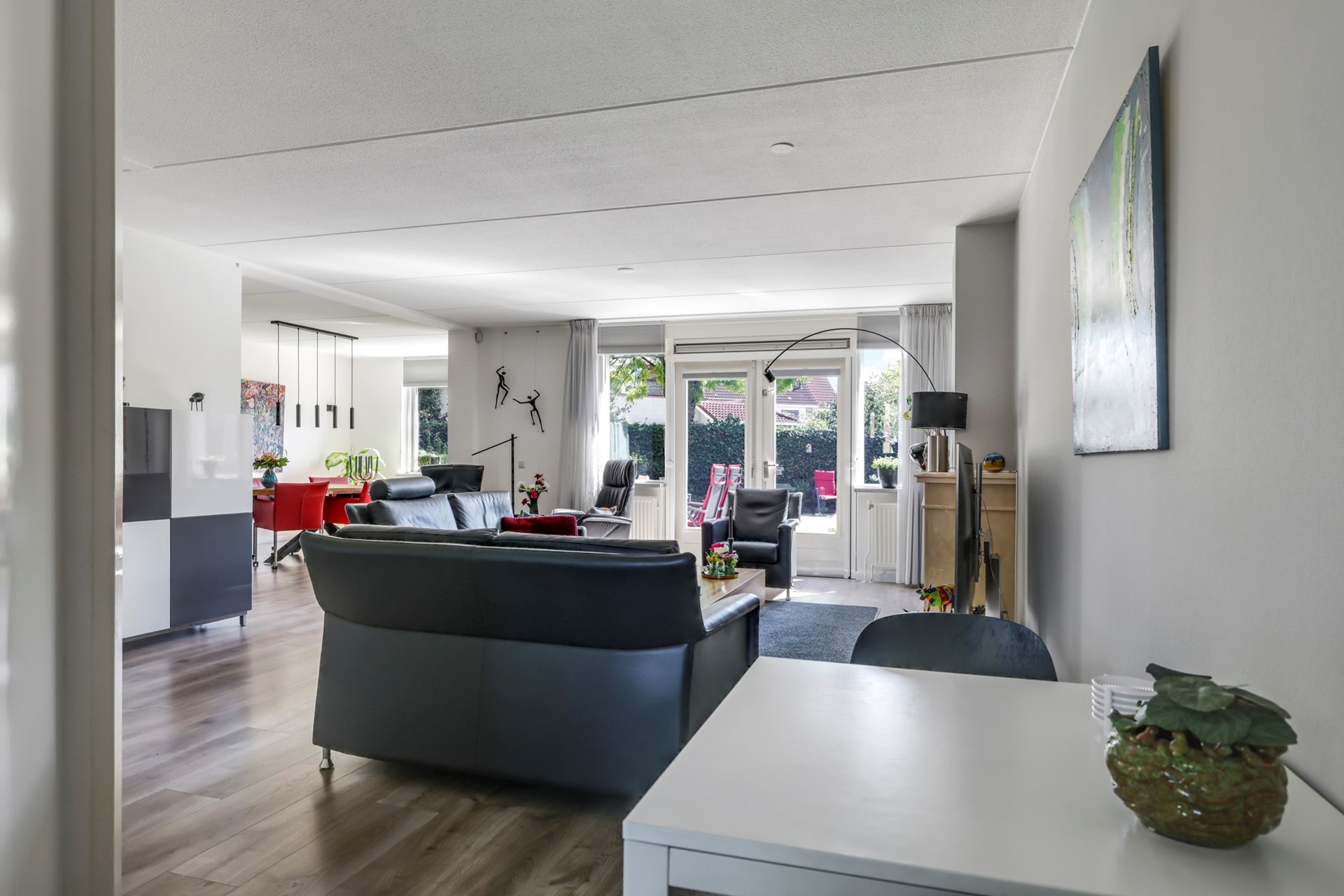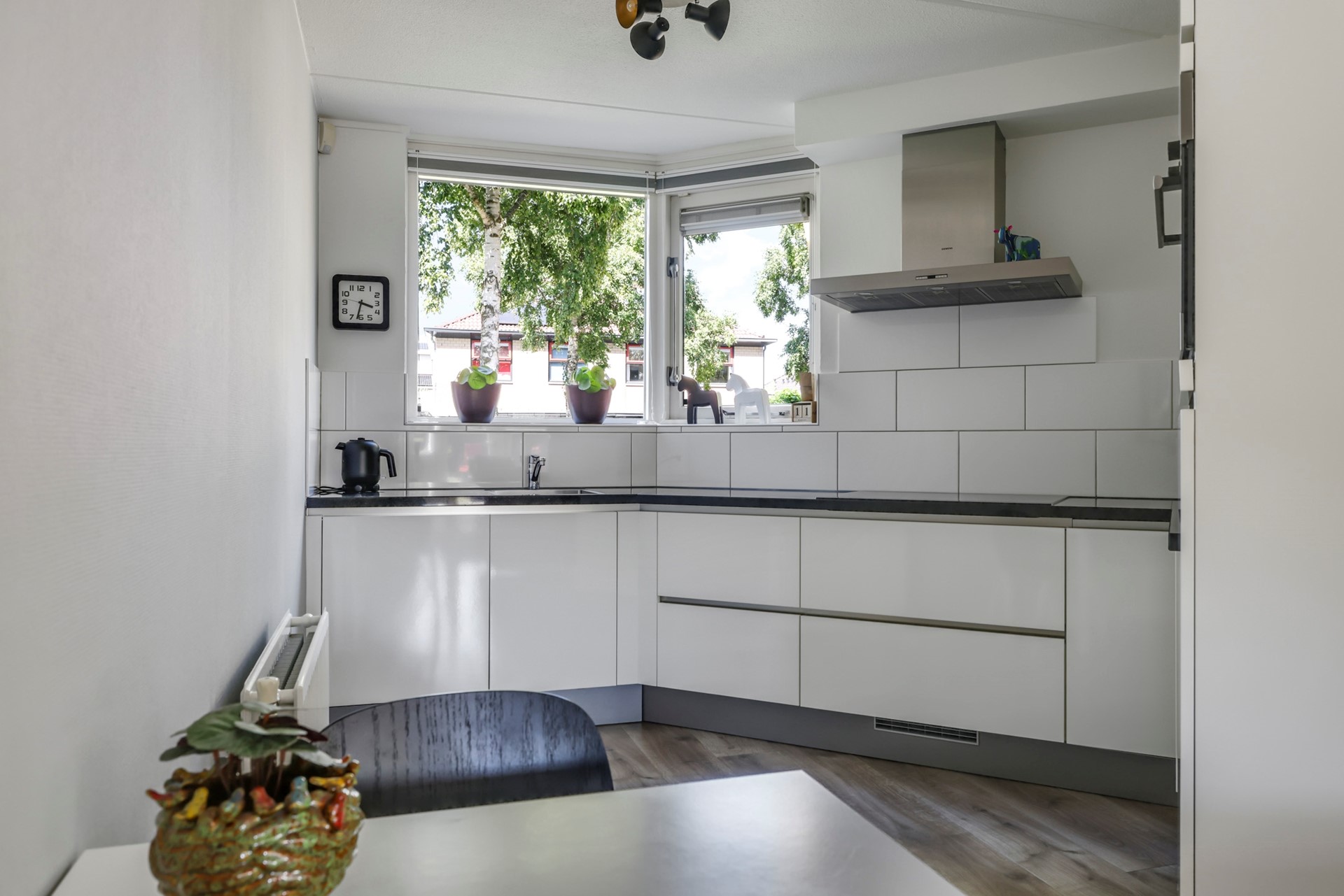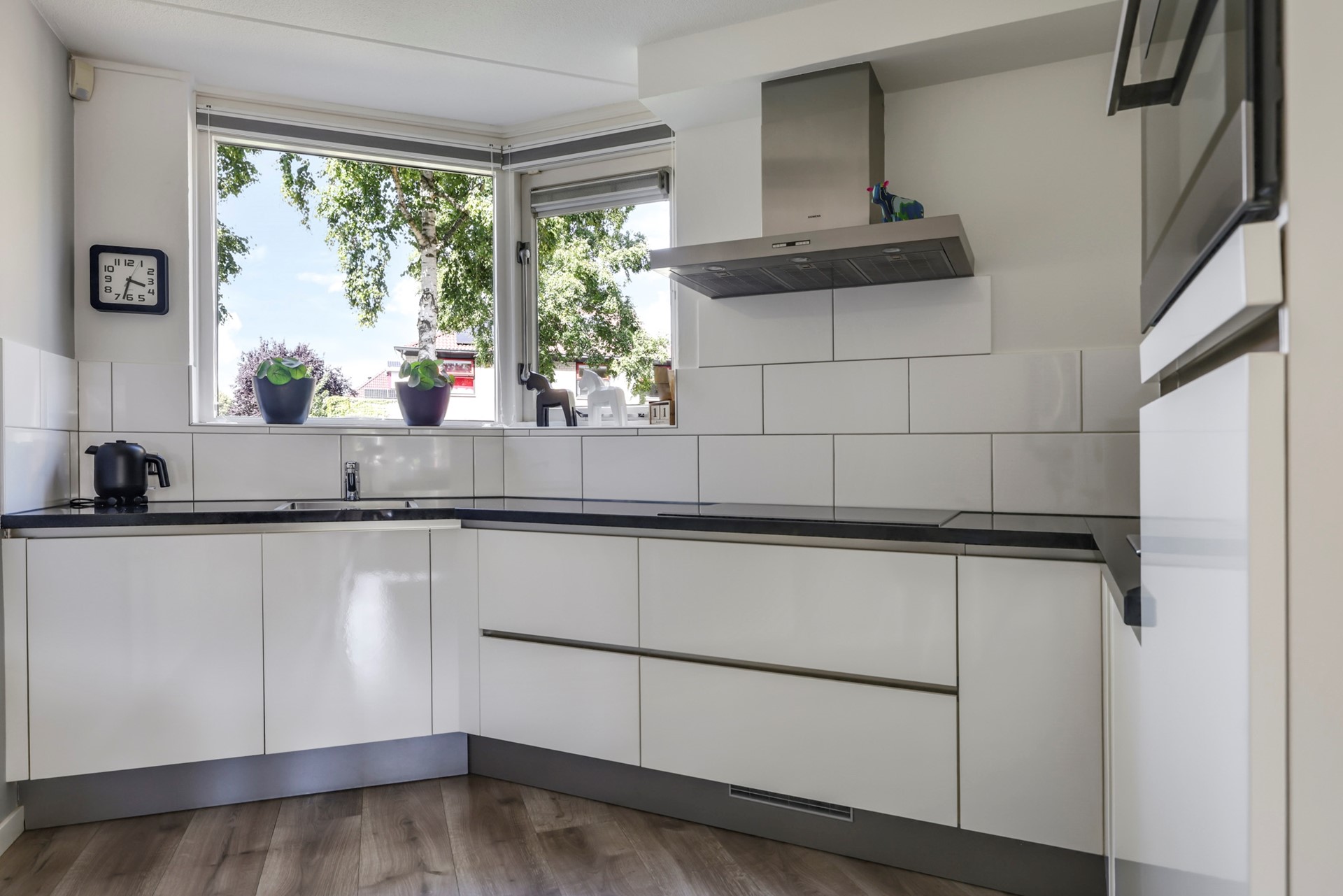 Aan de voorzijde ligt de moderne, witte hoekkeuken met greeploze kasten en inbouwapparatuur. Terwijl je kookt, kijk je fijn uit over de voortuin.