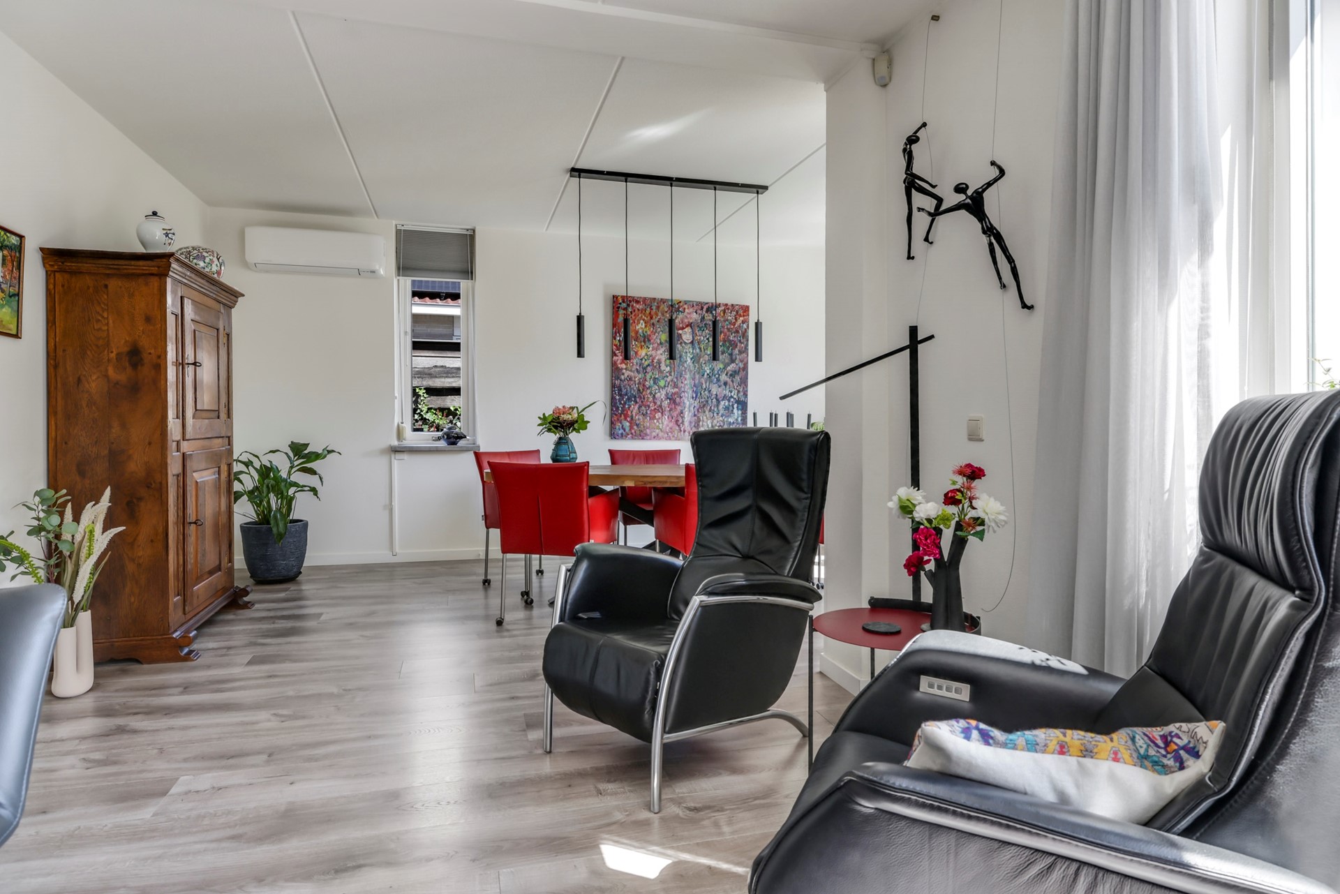 De woonkamer loopt vloeiend over in de ruime eetkamer met airconditioning en uitzicht op de achtertuin. Een ideale plek om uitgebreid te tafelen met familie en vrienden! Tevens is in woonkamer een praktische trapkast.