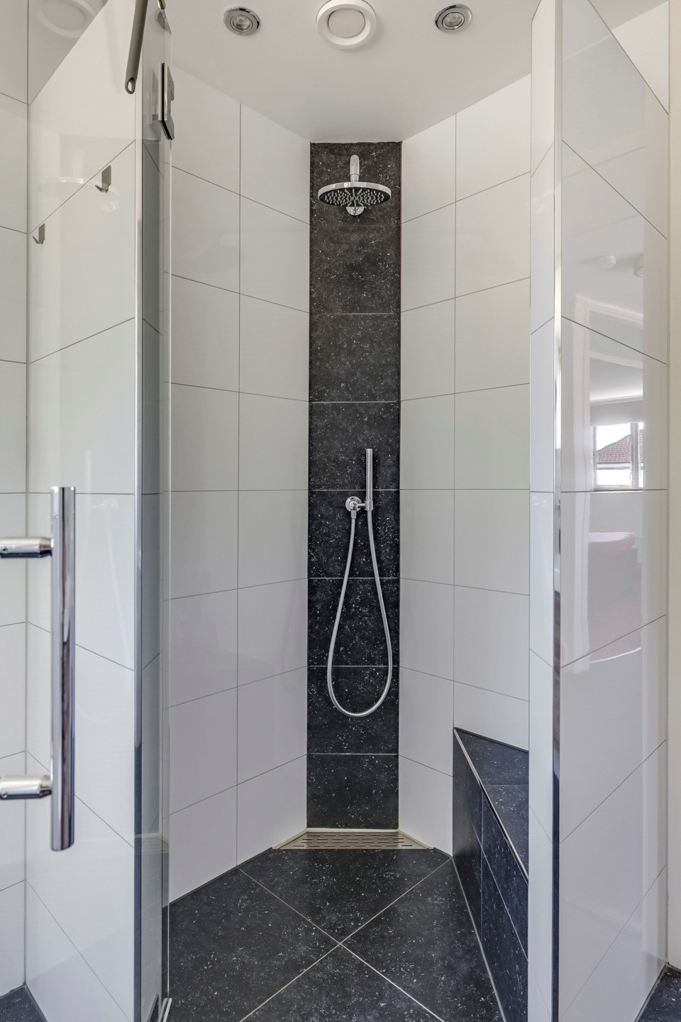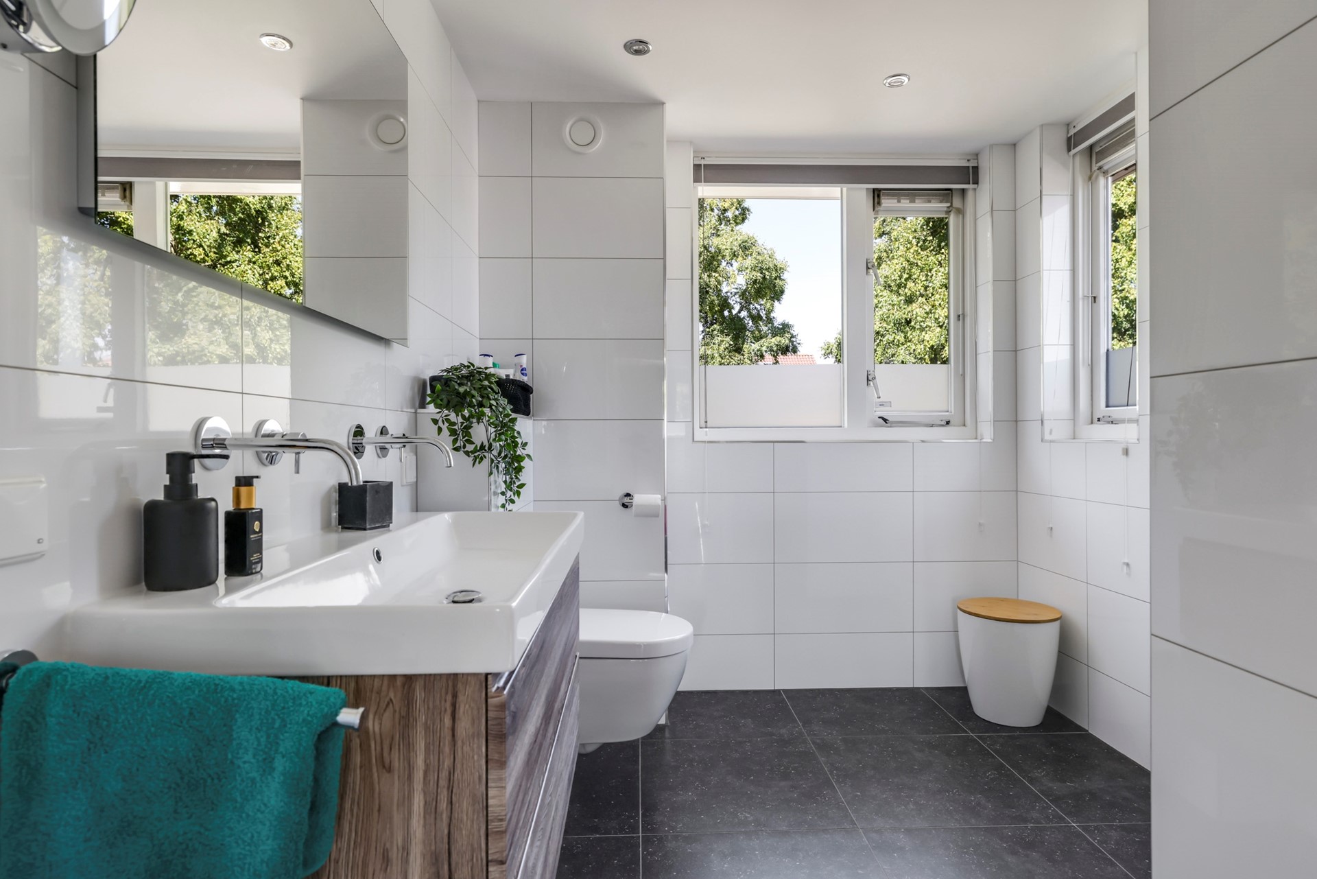 De badkamer is modern en compleet, voorzien van een dubbele wastafel met meubel, een inloopdouche en een toilet. Bovendien is er volop daglicht en is de badkamer voorzien van vloerverwarming.