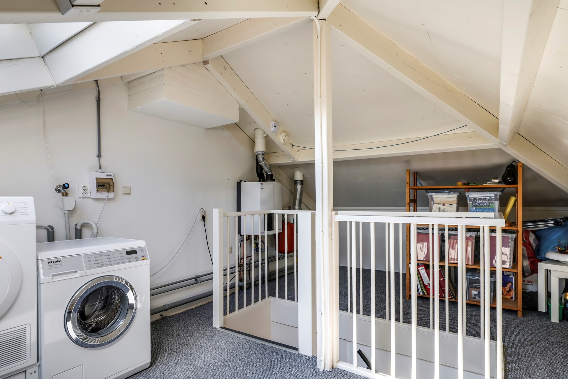 De tweede verdieping is een volwaardige zolder, bereikbaar via een vaste trap. Hier vind je de aansluitingen voor wasmachine en droger en voldoende opbergruimte. De zolder is voorzien ven een groot Velux dakraam met elektrische rolluik. Dankzij de lichtinval is dit ook een perfecte plek voor een compacte thuiswerkplek of hobbyruimte.