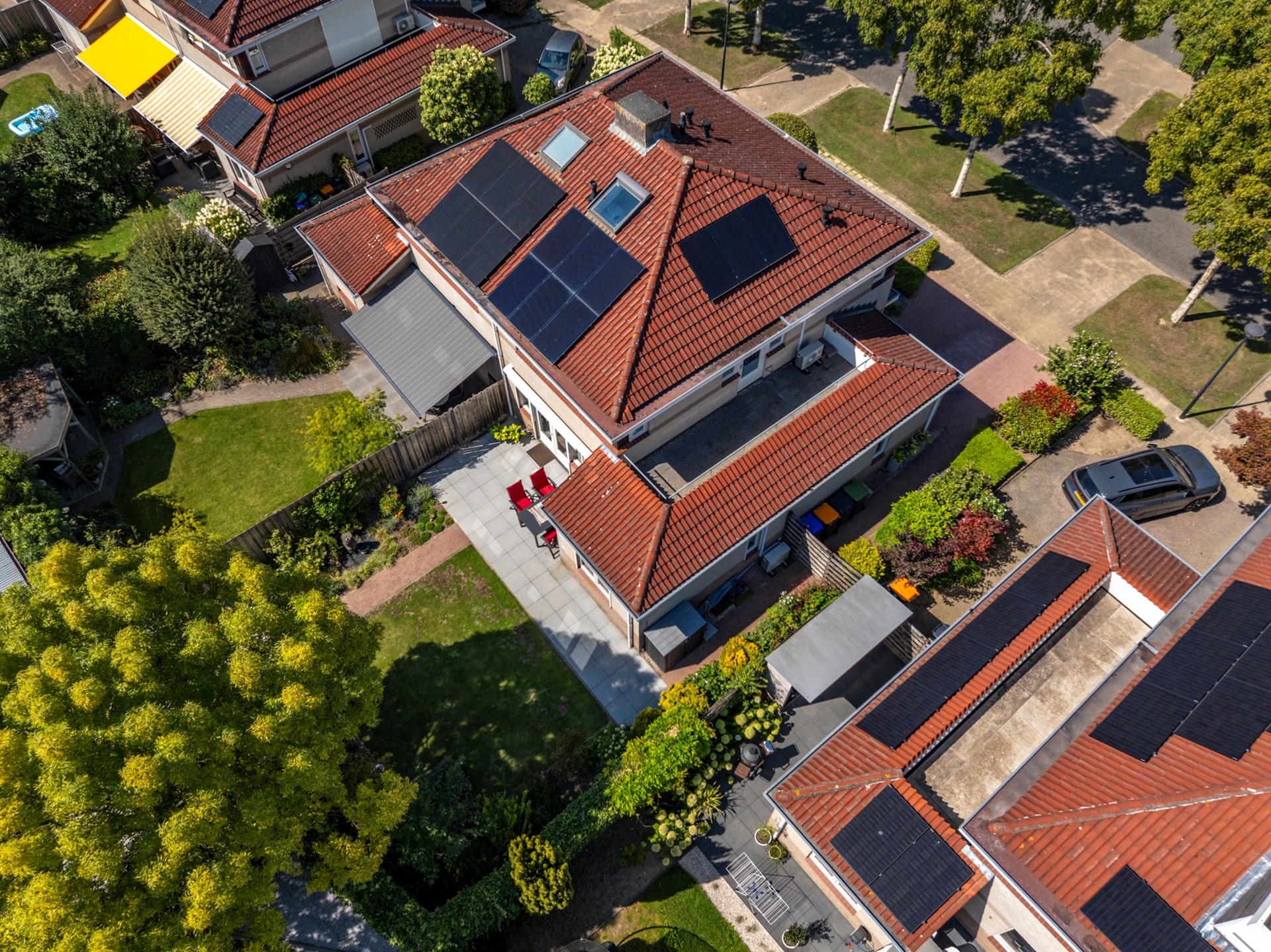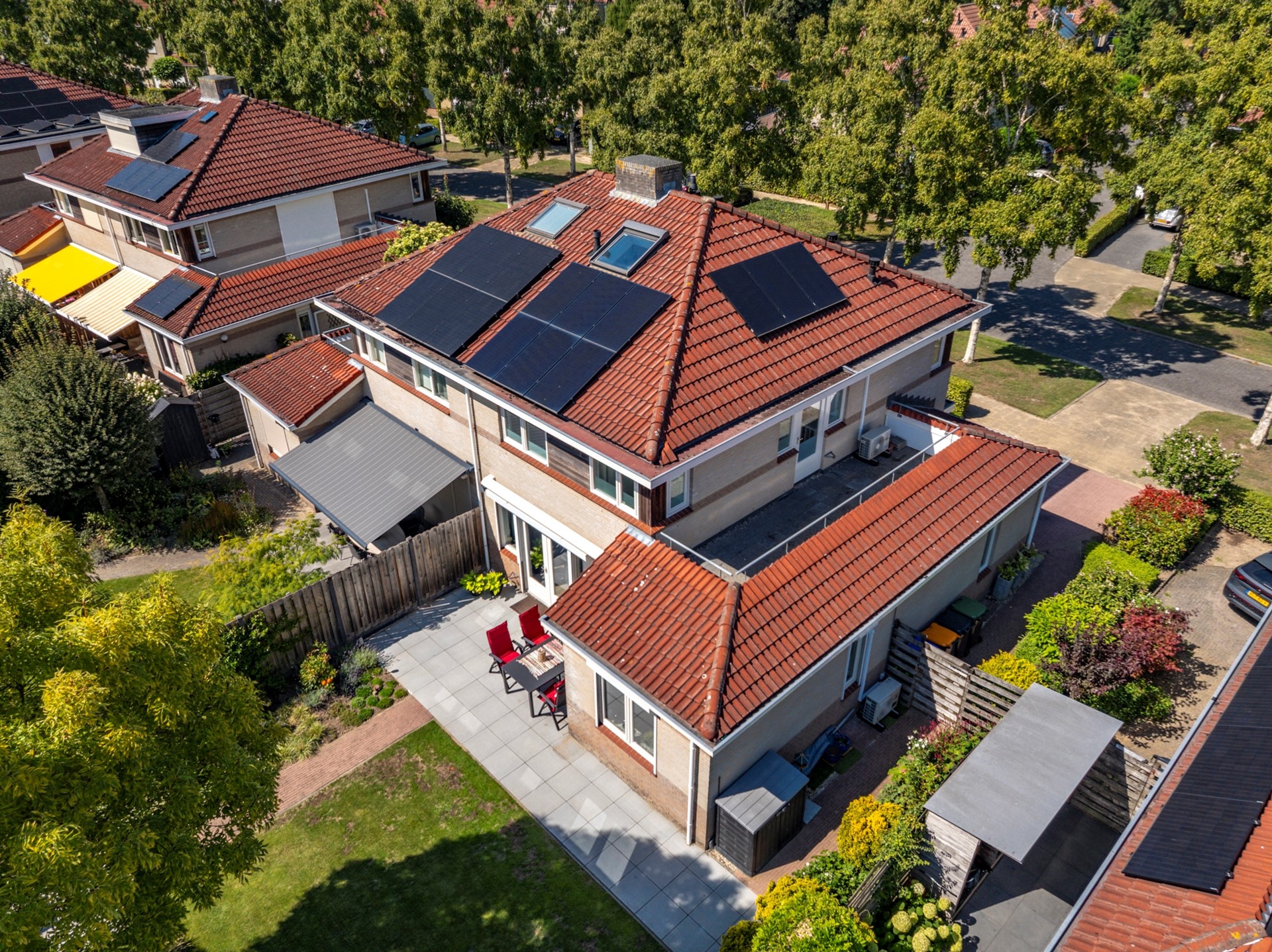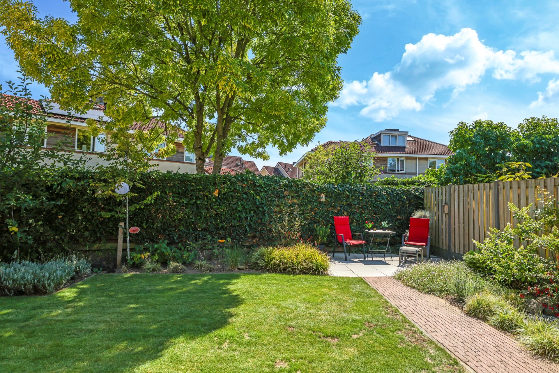 De achtertuin is een waar buitenparadijs: veel privacy, groen en meerdere terrassen. Direct aan de woning ligt een groot betegeld terras, ideaal voor lange zomeravonden. Verderop in de tuin vind je een tweede terras, bereikbaar via een pad langs het gazon en de smaakvolle beplanting. De tuin is ook bereikbaar via de zijkant van de woning.