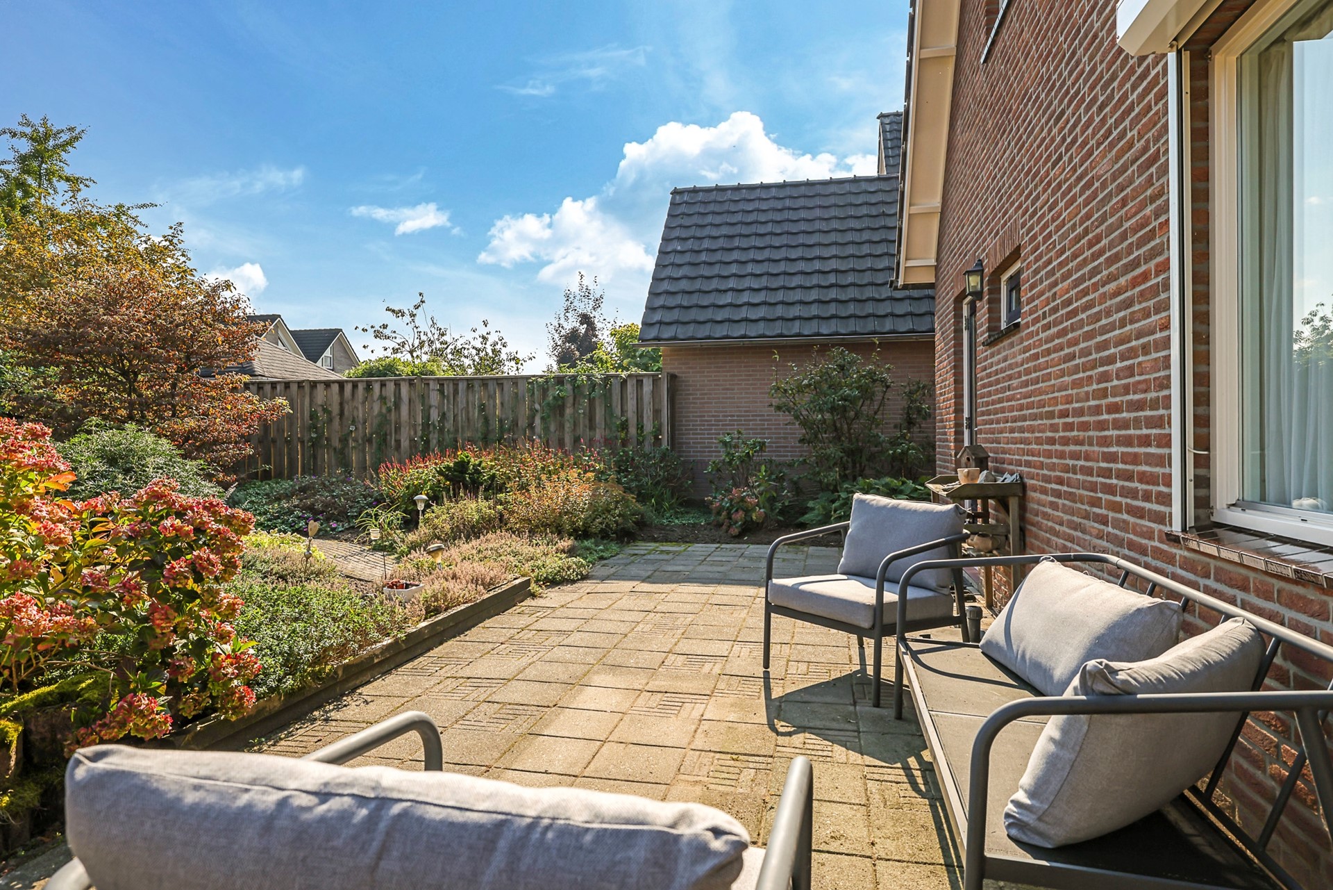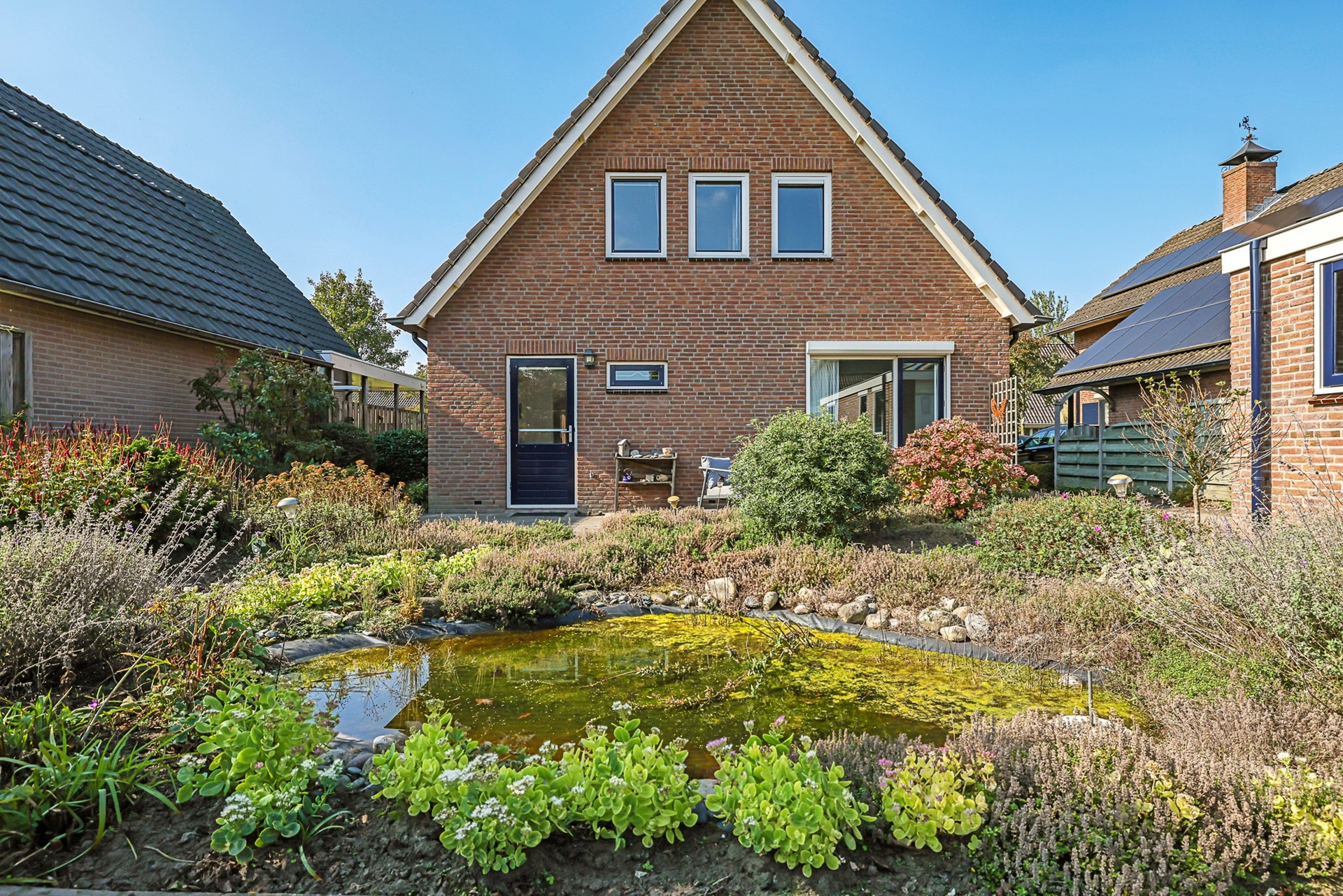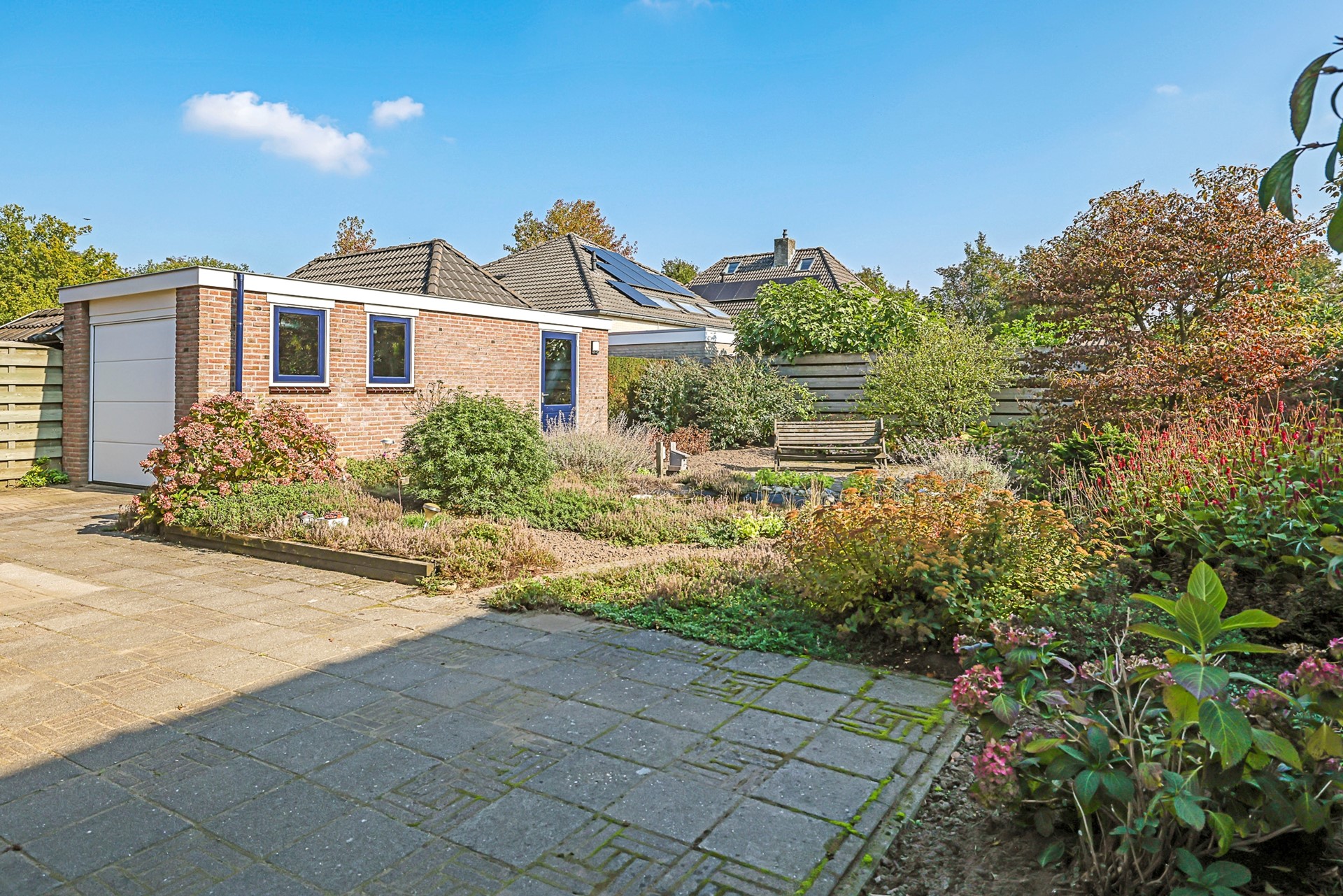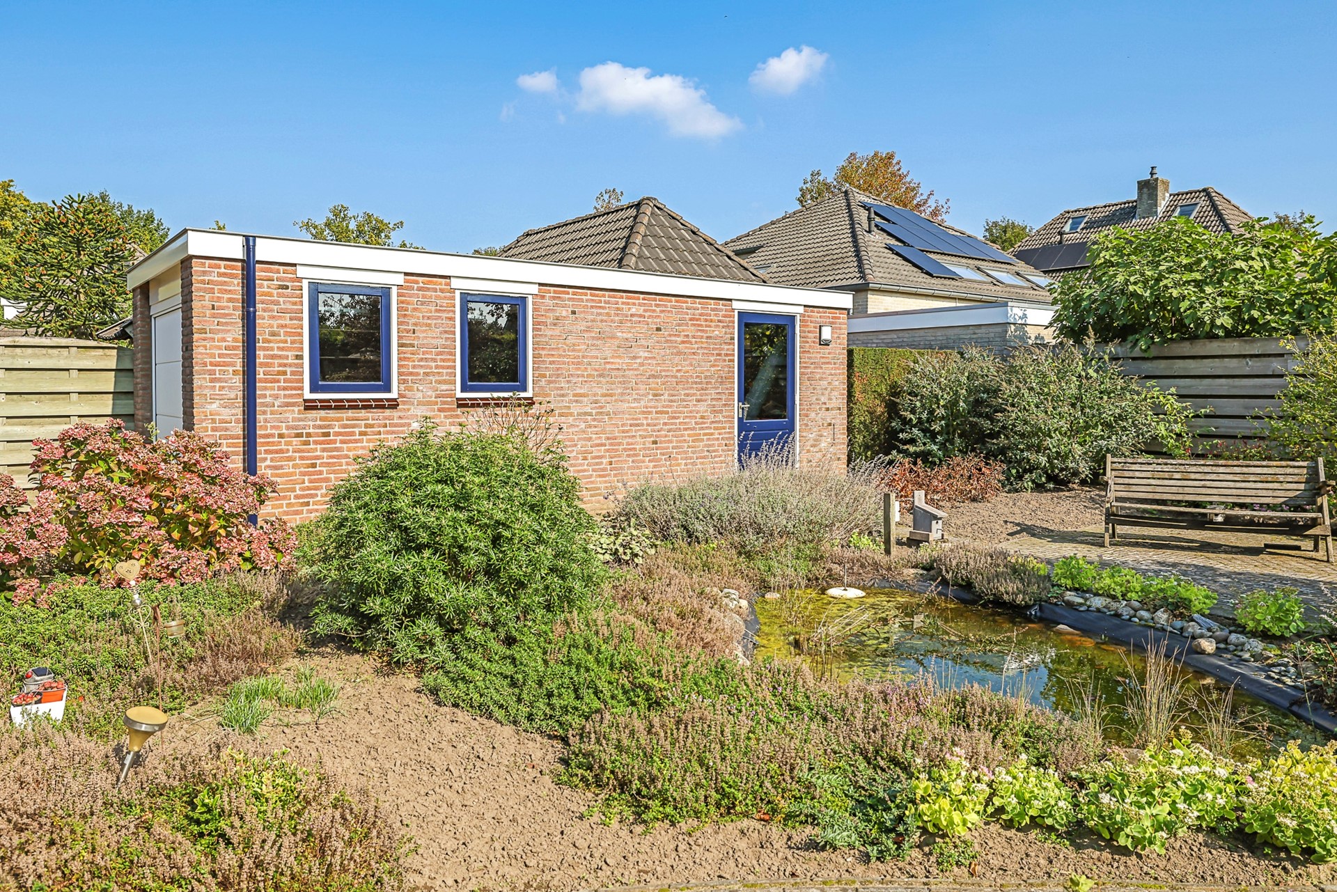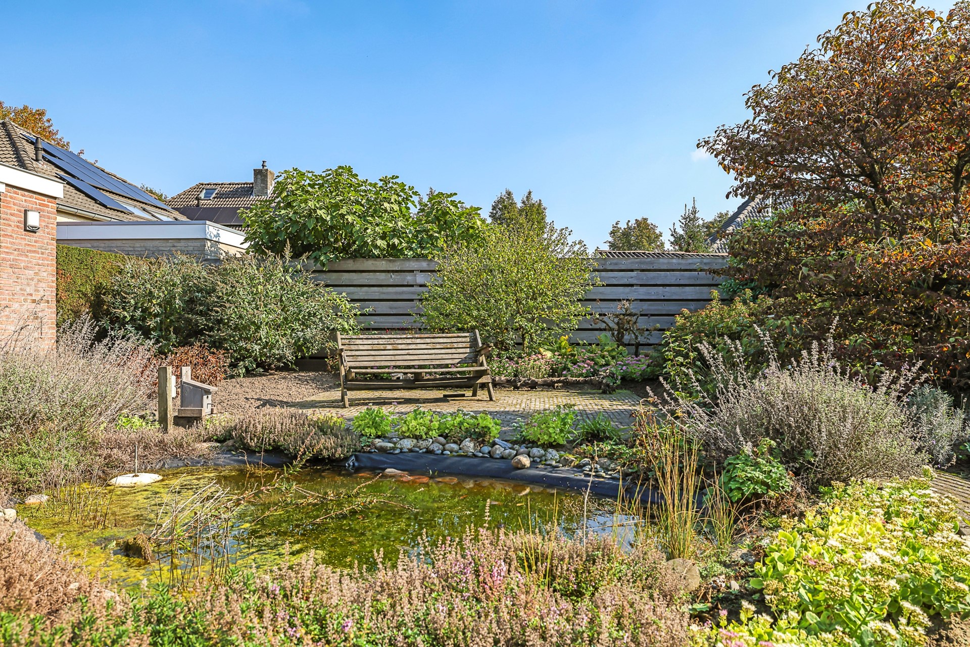 Rondom de woning ligt een prachtig aangelegde tuin die veel privacy biedt. Aangrenzend aan de woning vind je een royaal betegeld terras, ideaal voor lange zomeravonden. Verderop in de tuin ligt nog een tweede terras, verscholen tussen het groen, waar je in alle rust kunt genieten. De vijver, volwassen beplanting en speelse indeling maken dit tot een plek waar je het hele jaar door buitenplezier hebt. De tuin is ook bereikbaar via de ruime oprit aan de linkerzijde van de woning, die plaats biedt aan meerdere auto’s en doorloopt naar de losse stenen garage.