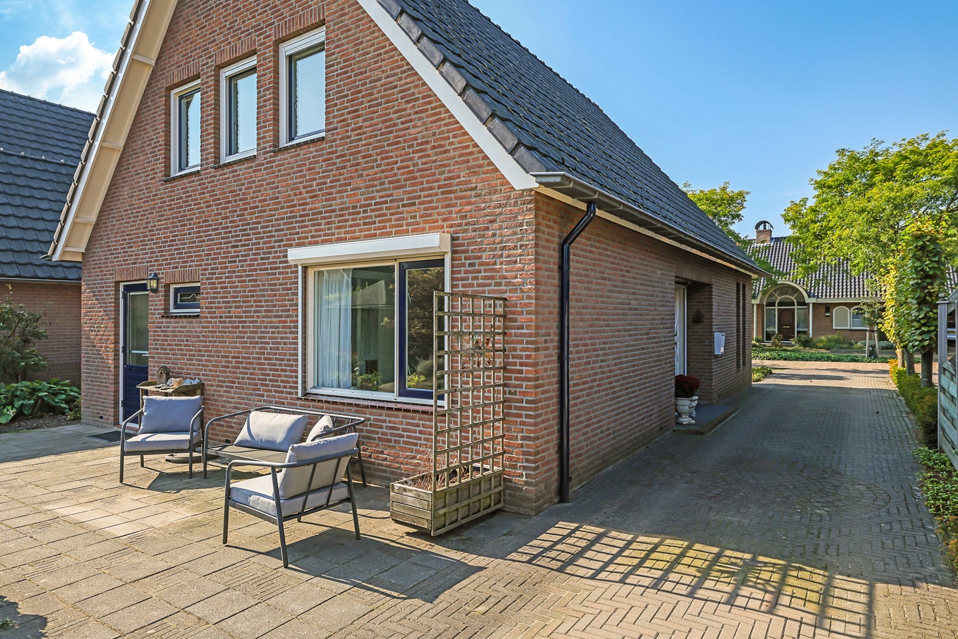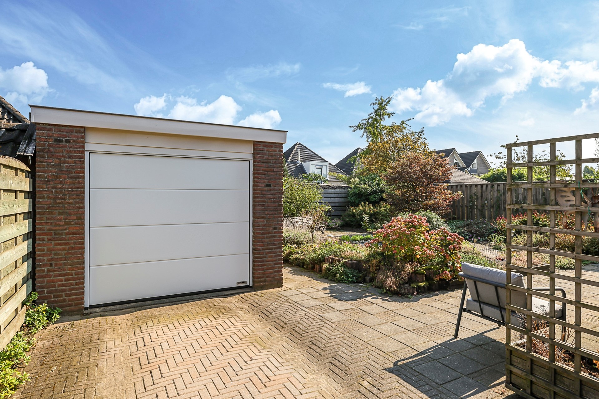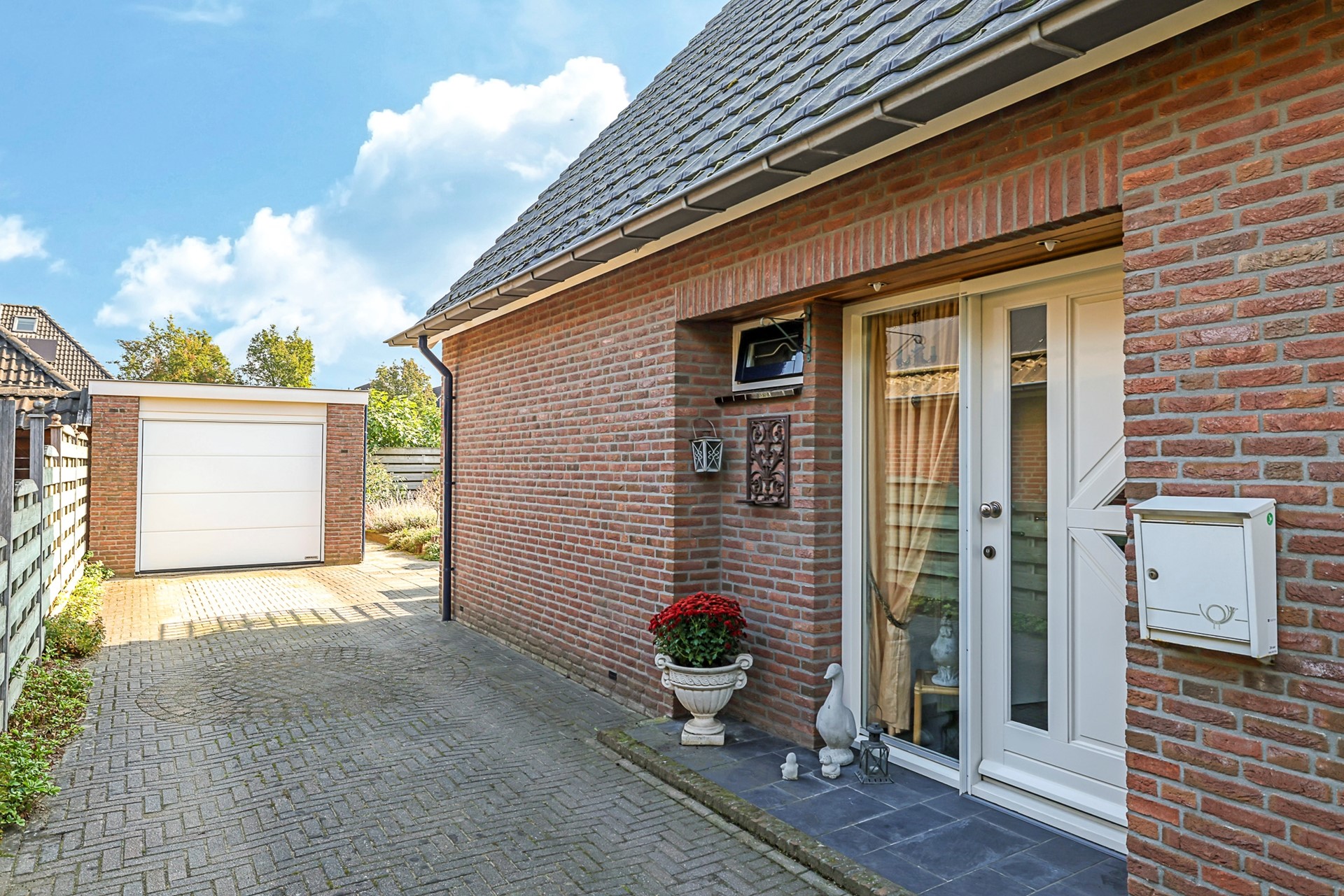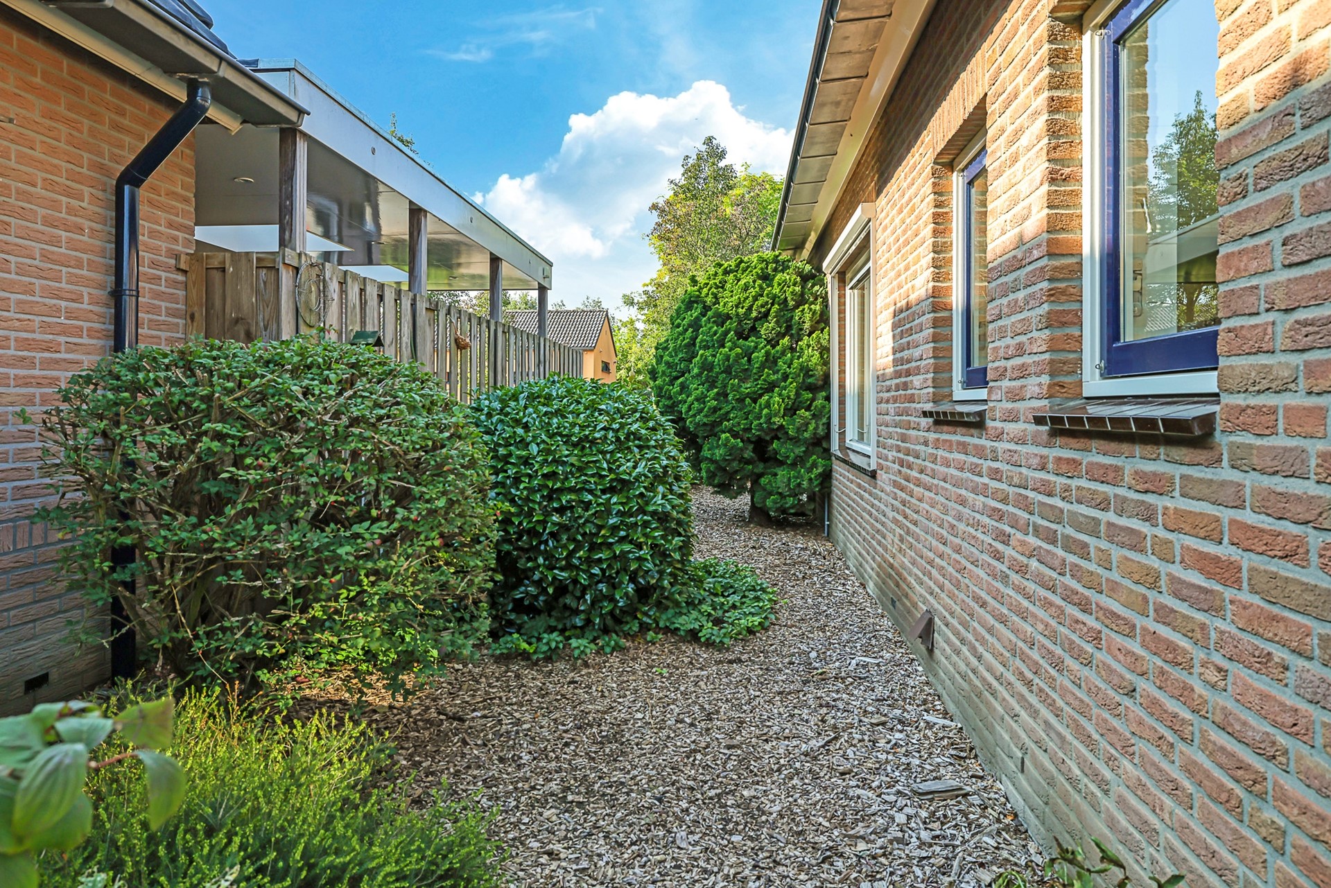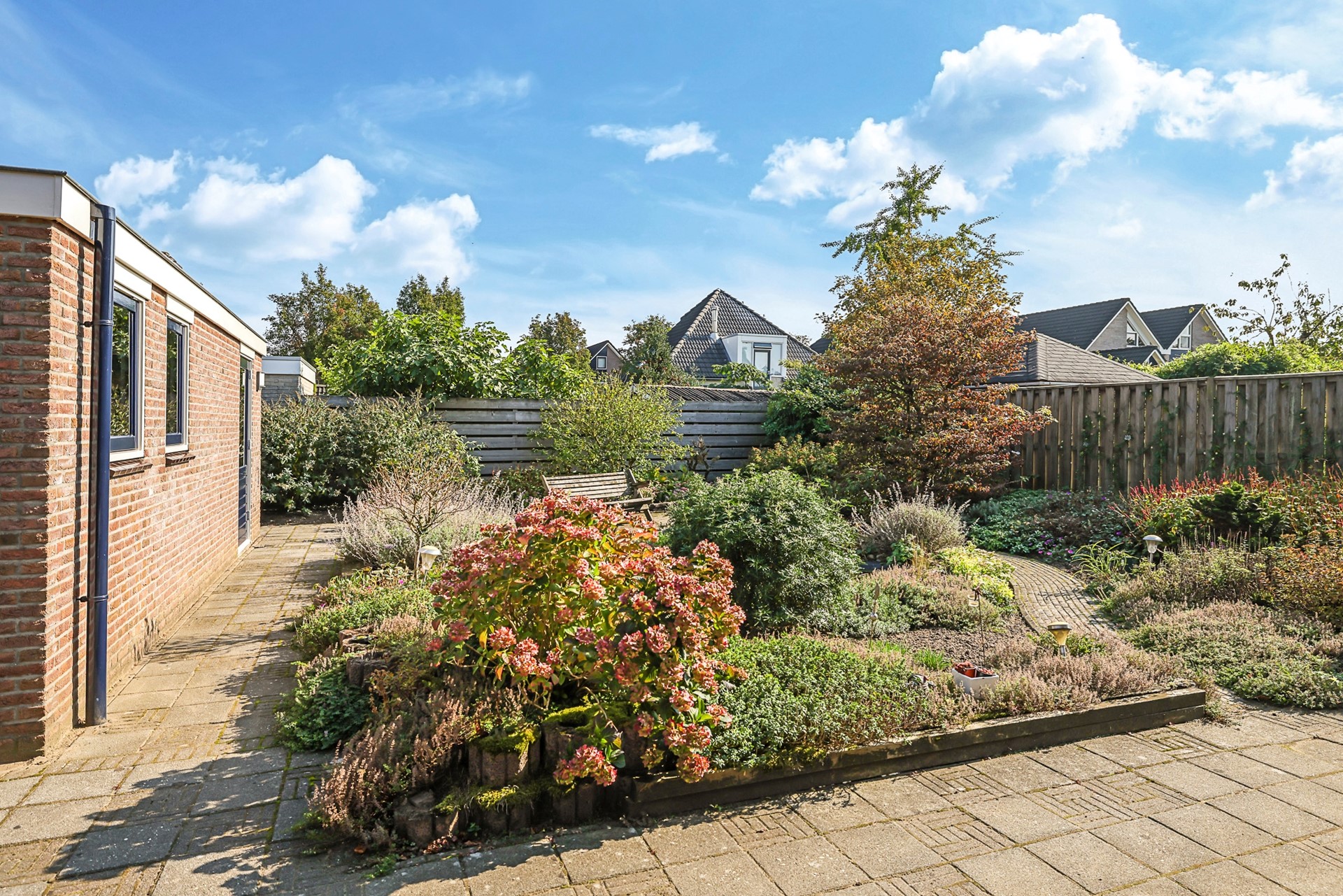 Rondom de woning ligt een prachtig aangelegde tuin die veel privacy biedt. Aangrenzend aan de woning vind je een royaal betegeld terras, ideaal voor lange zomeravonden. Verderop in de tuin ligt nog een tweede terras, verscholen tussen het groen, waar je in alle rust kunt genieten. De vijver, volwassen beplanting en speelse indeling maken dit tot een plek waar je het hele jaar door buitenplezier hebt. De tuin is ook bereikbaar via de ruime oprit aan de linkerzijde van de woning, die plaats biedt aan meerdere auto’s en doorloopt naar de losse stenen garage.