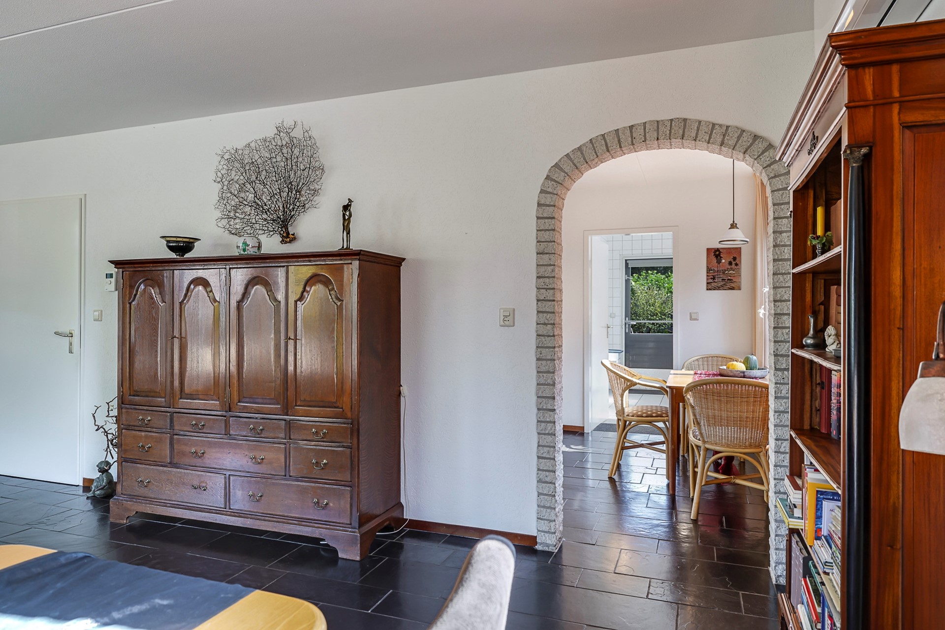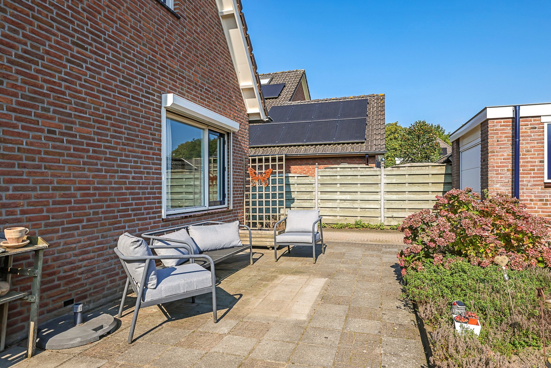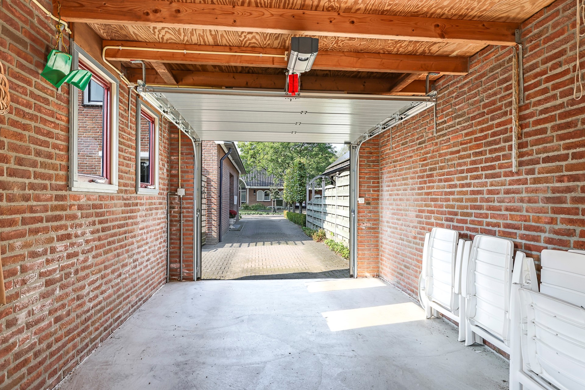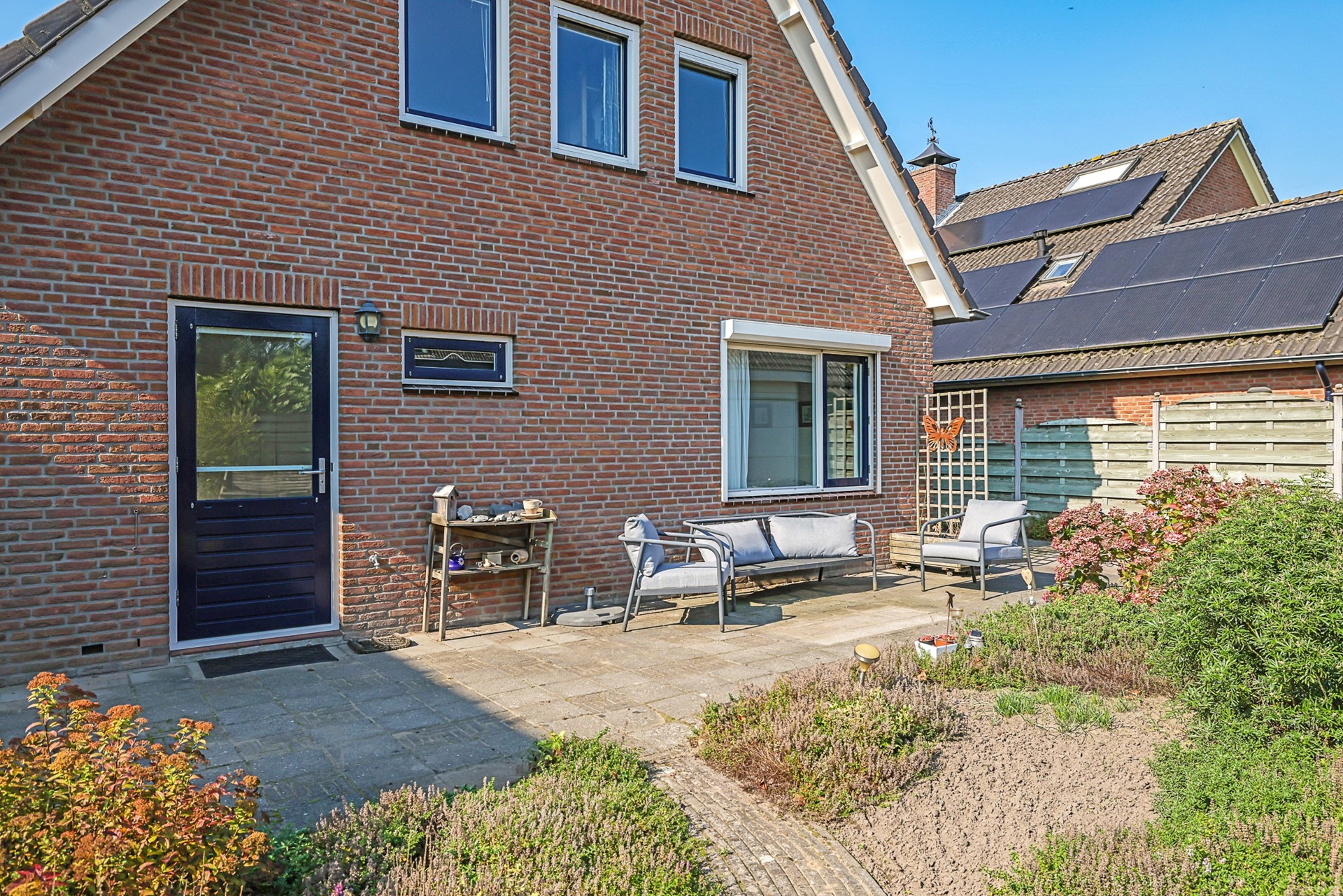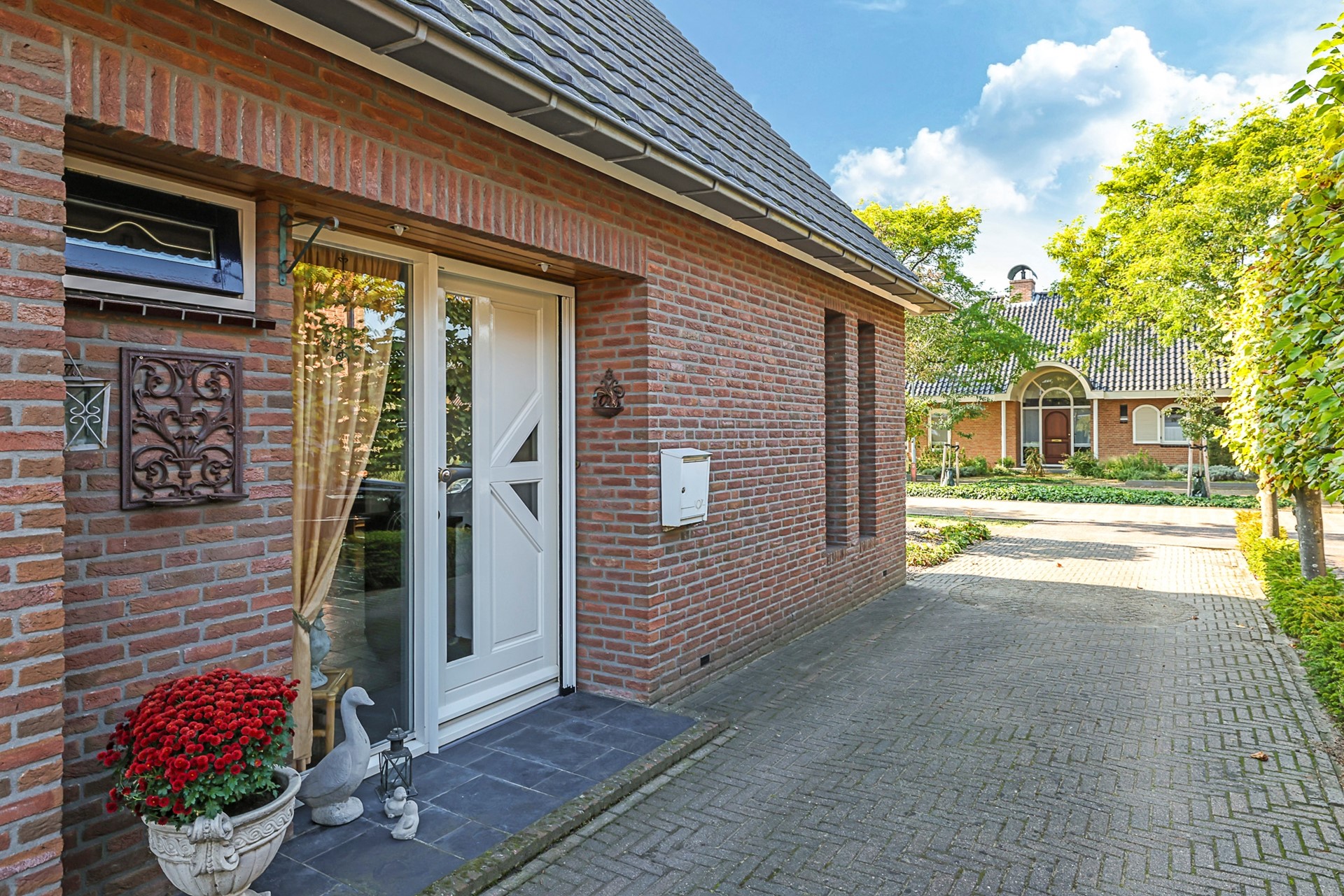 Rondom de woning ligt een prachtig aangelegde tuin die veel privacy biedt. Aangrenzend aan de woning vind je een royaal betegeld terras, ideaal voor lange zomeravonden. Verderop in de tuin ligt nog een tweede terras, verscholen tussen het groen, waar je in alle rust kunt genieten. De vijver, volwassen beplanting en speelse indeling maken dit tot een plek waar je het hele jaar door buitenplezier hebt. De tuin is ook bereikbaar via de ruime oprit aan de linkerzijde van de woning, die plaats biedt aan meerdere auto’s en doorloopt naar de losse stenen garage.