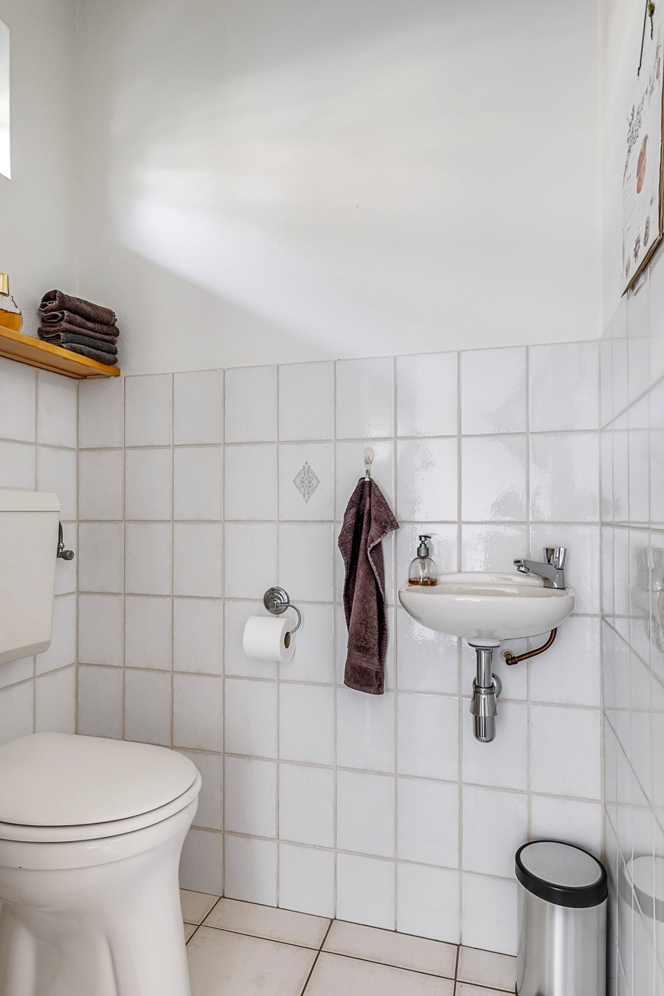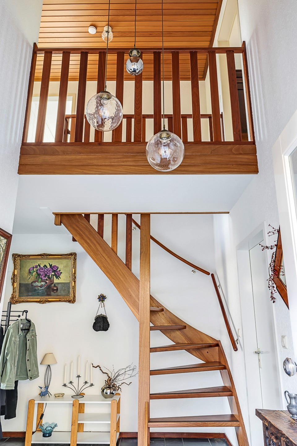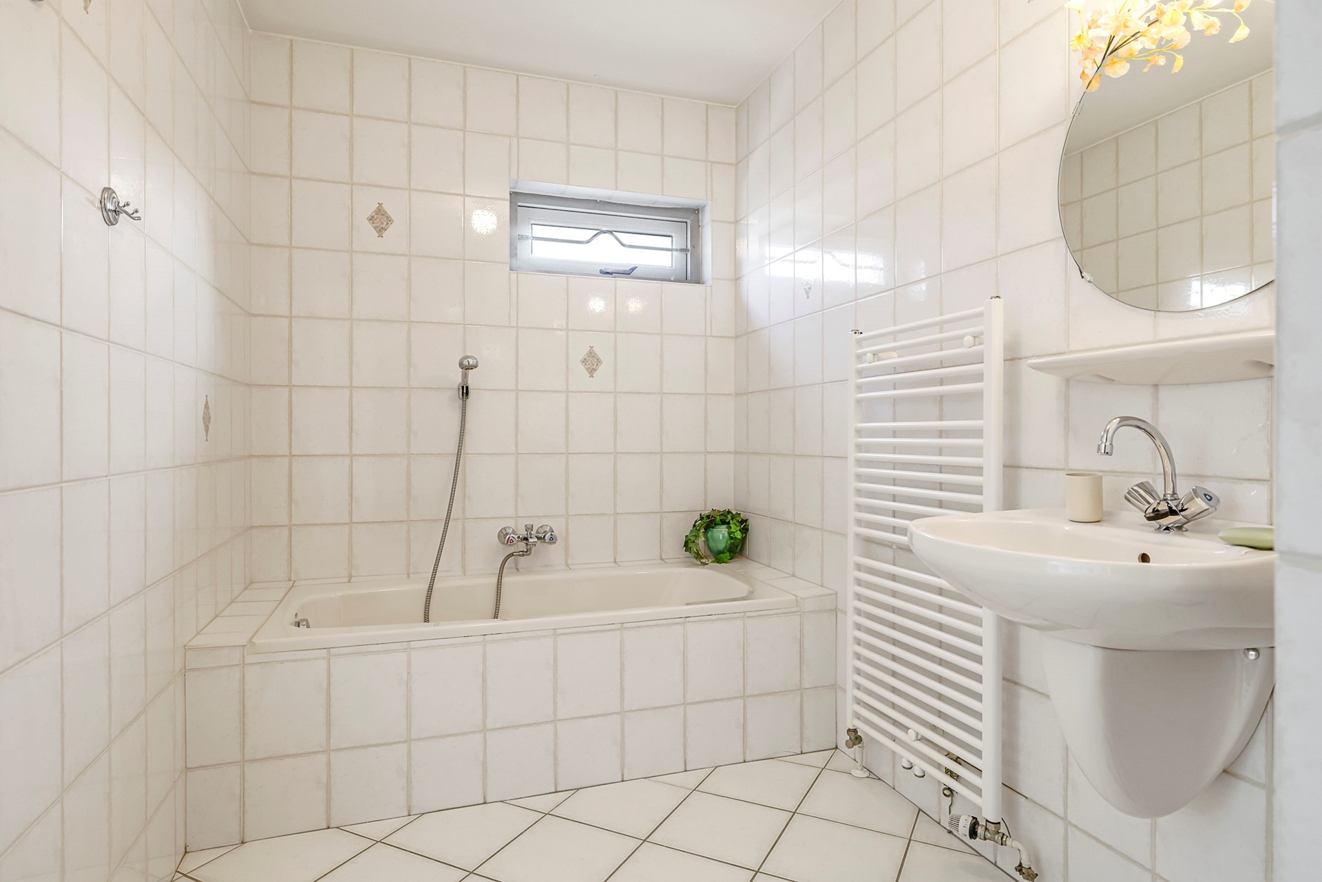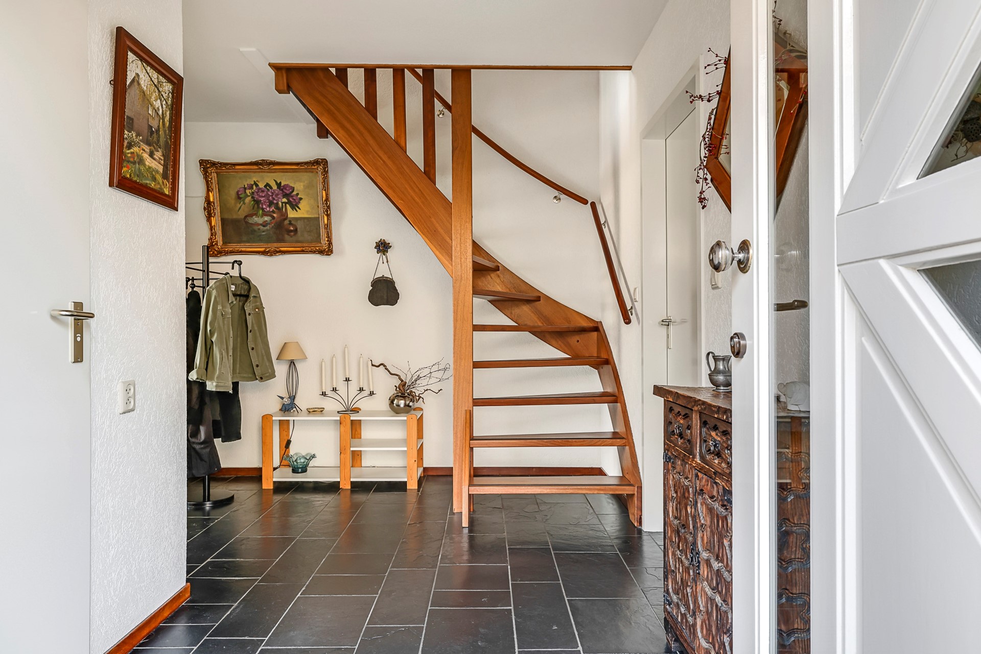 You enter through a very spacious hallway with tiled floor. Here you will find a separate WC with washbasin and the staircase to the first floor. A major advantage of this property: the ground floor features a generous bedroom with an adjoining bathroom in light tones, equipped with a washbasin, walk-in shower and bathtub. In short: ideal for single-level living.