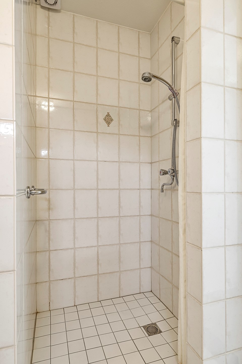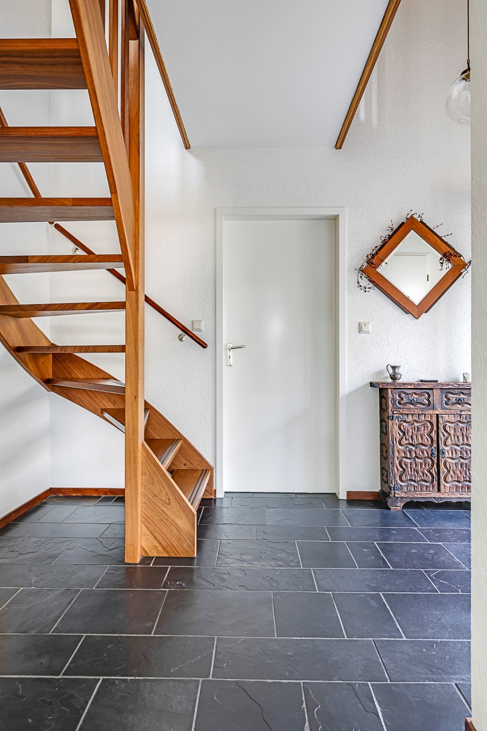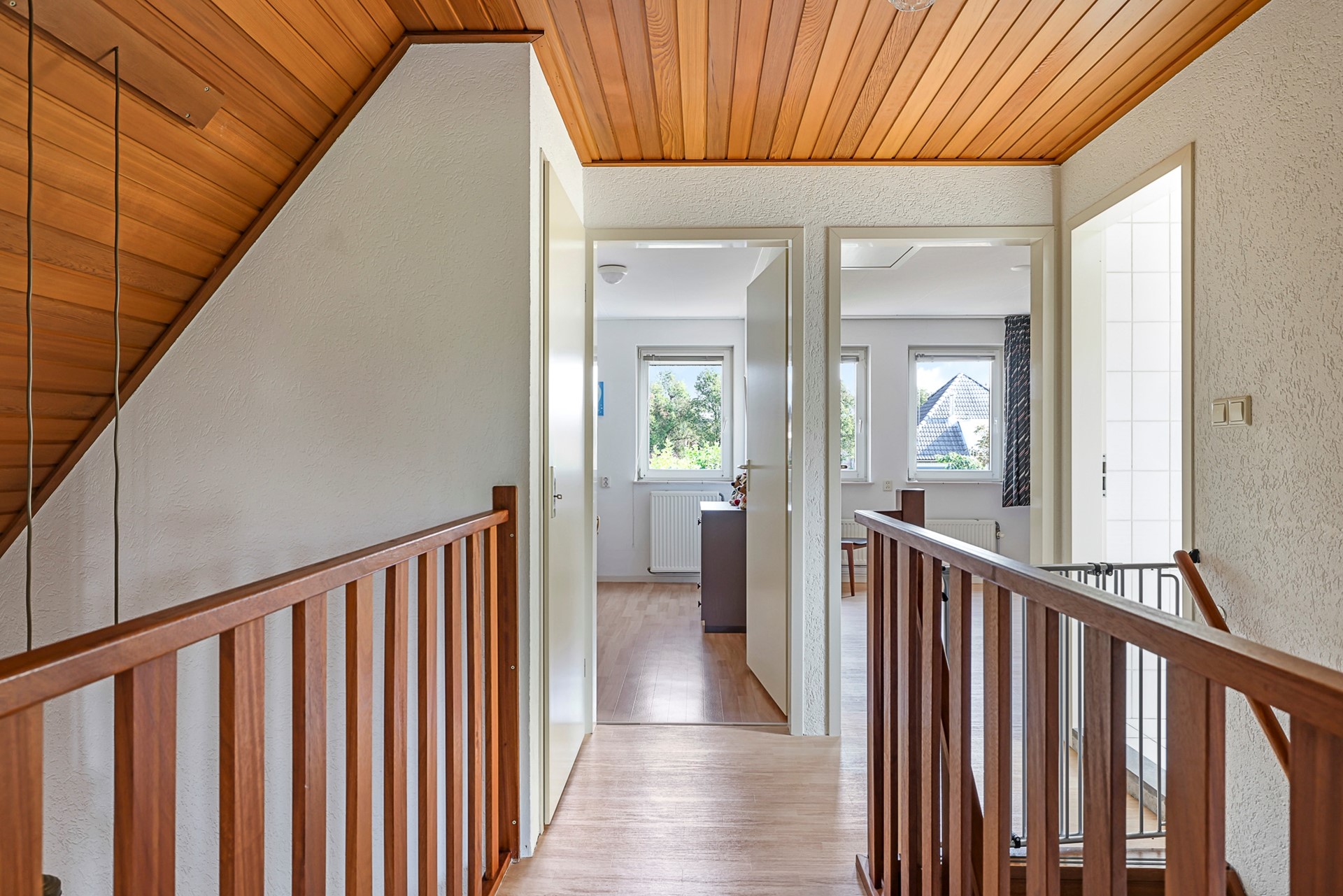 Upstairs, a playful mezzanine opens onto the landing. From here you have access to three bedrooms and the second bathroom. Everything is well maintained, though a new owner could of course easily update the style if desired. The master bedroom is particularly large and offers additional possibilities for a workspace, hobby area or a generously sized walk-in wardrobe. The other two bedrooms are also of a good size. From one of these rooms you can reach the loft via a loft ladder. The property’s second bathroom is light and neutral, with a shower, washbasin and WC.