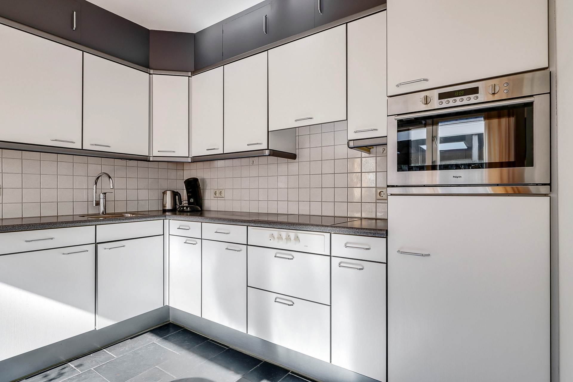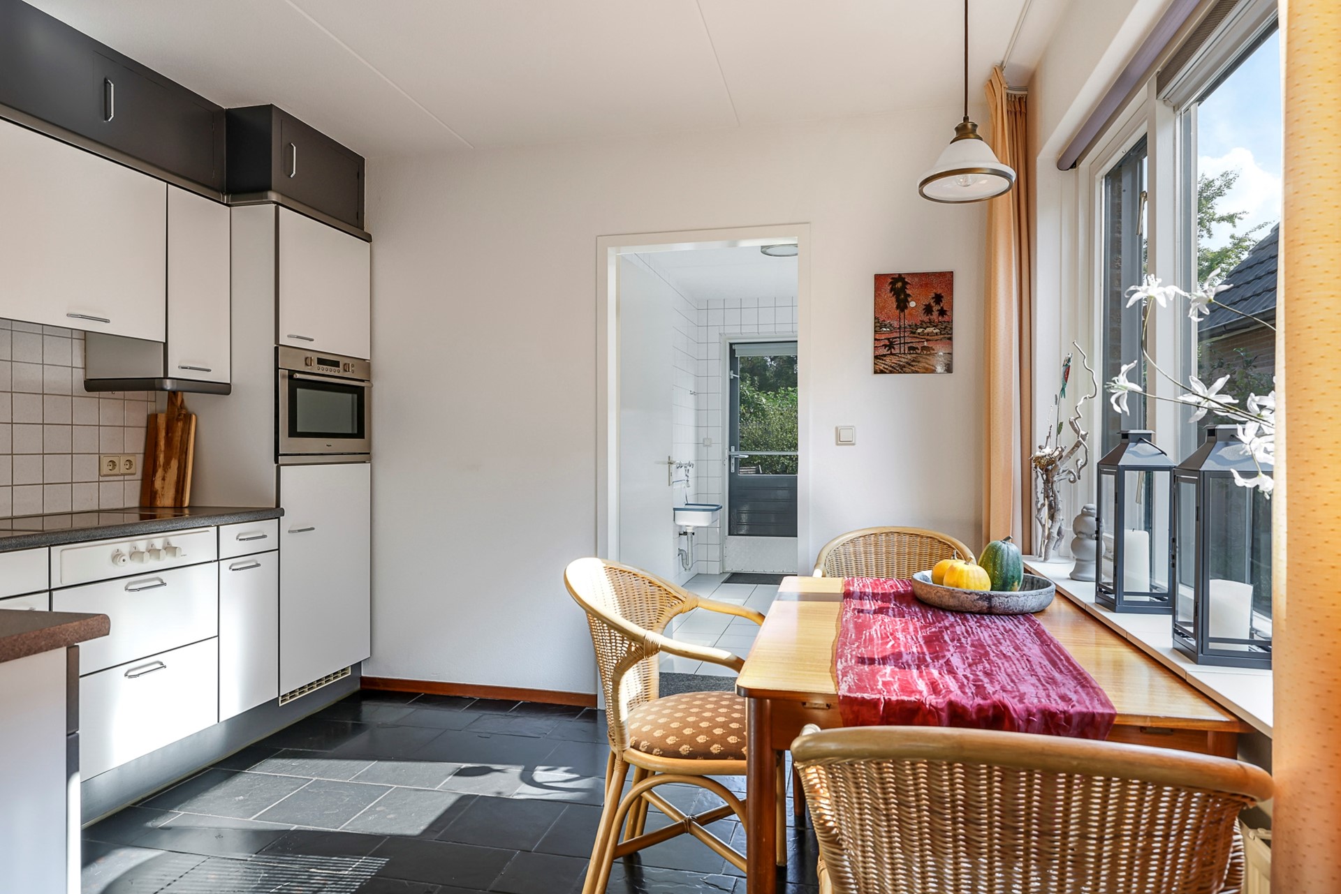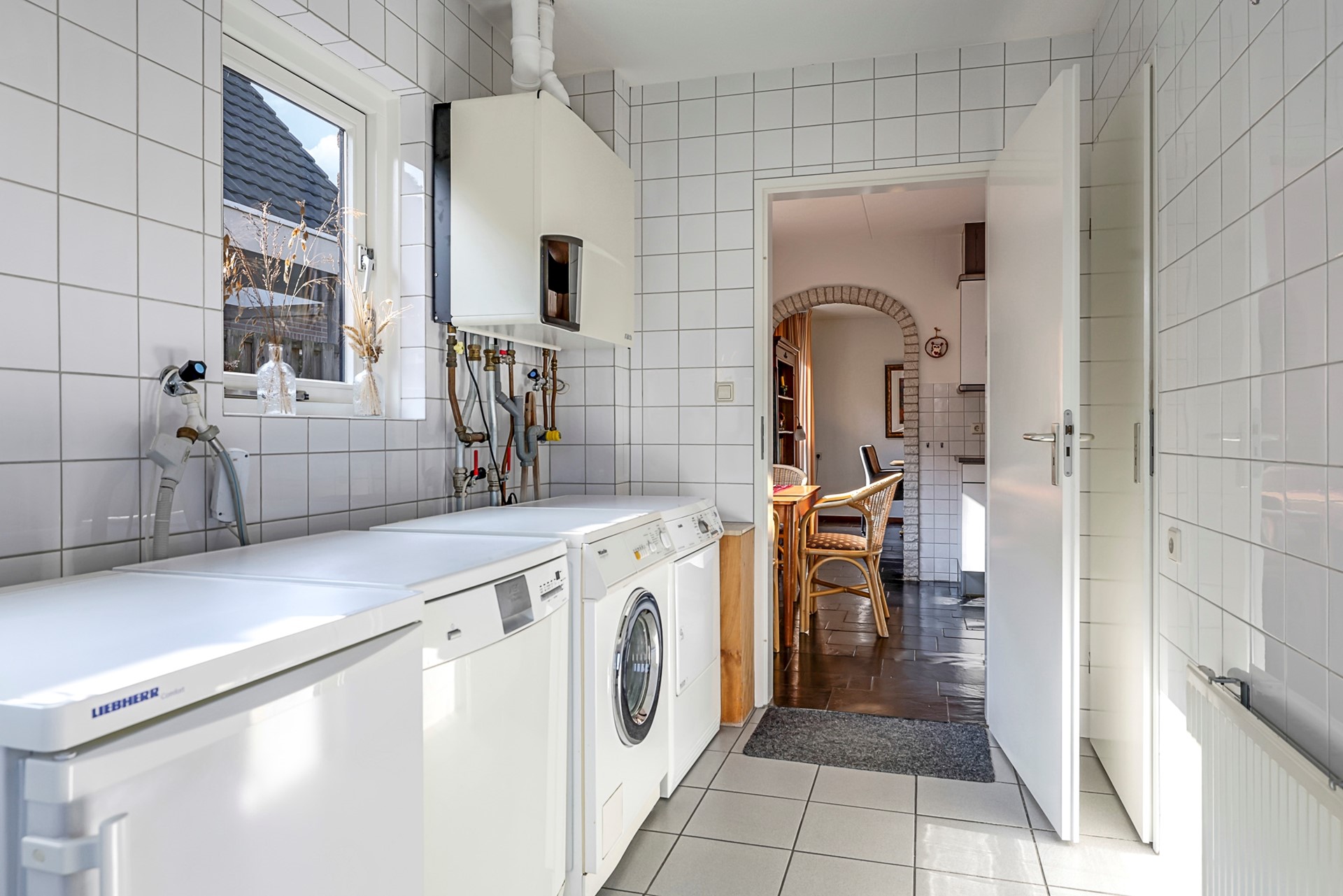 Aan de rechterzijde van de hal ligt de riante woon-eetkamer met dezelfde tegelvloer en grote raampartijen die zorgen voor een fijne lichtinval en een prachtig uitzicht op de groene tuin. Voor extra comfort beschikt de woonkamer over airconditioning. De aangrenzende keuken is uitgevoerd in een praktische witte hoekopstelling en is lekker ruim en licht. Vanuit de keuken is er toegang tot de bijkeuken, waar je aansluitingen vindt voor wasmachine en droger en volop bergruimte hebt. Vanuit de bijkeuken loop je zo de tuin in.