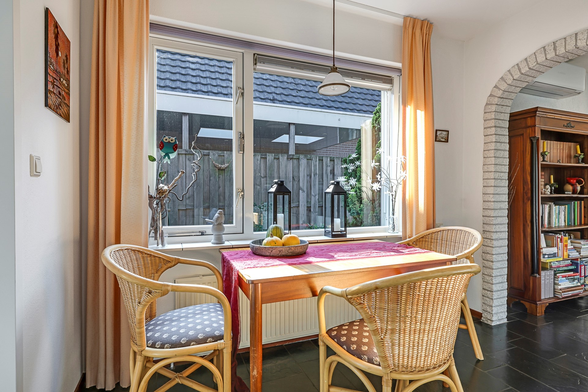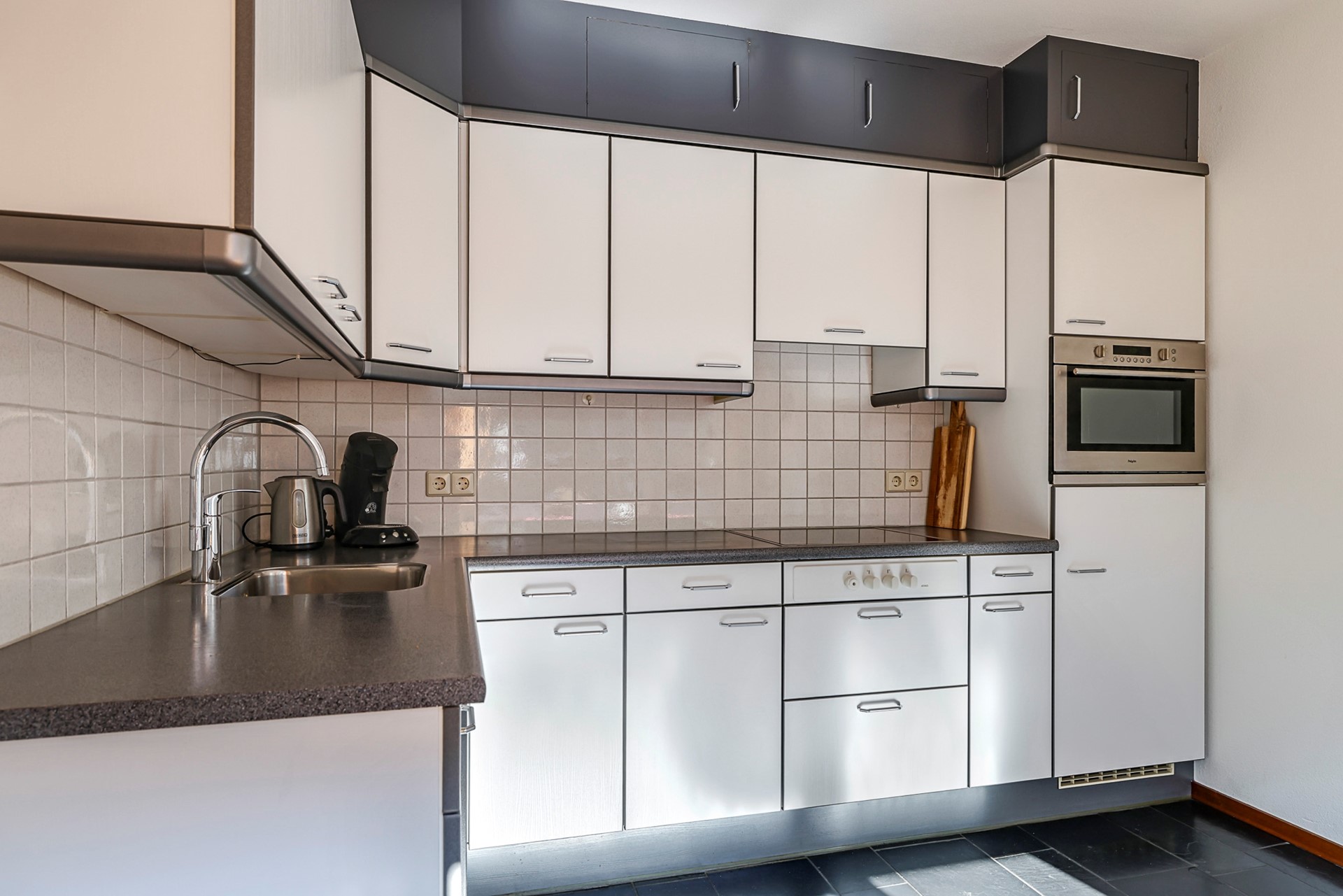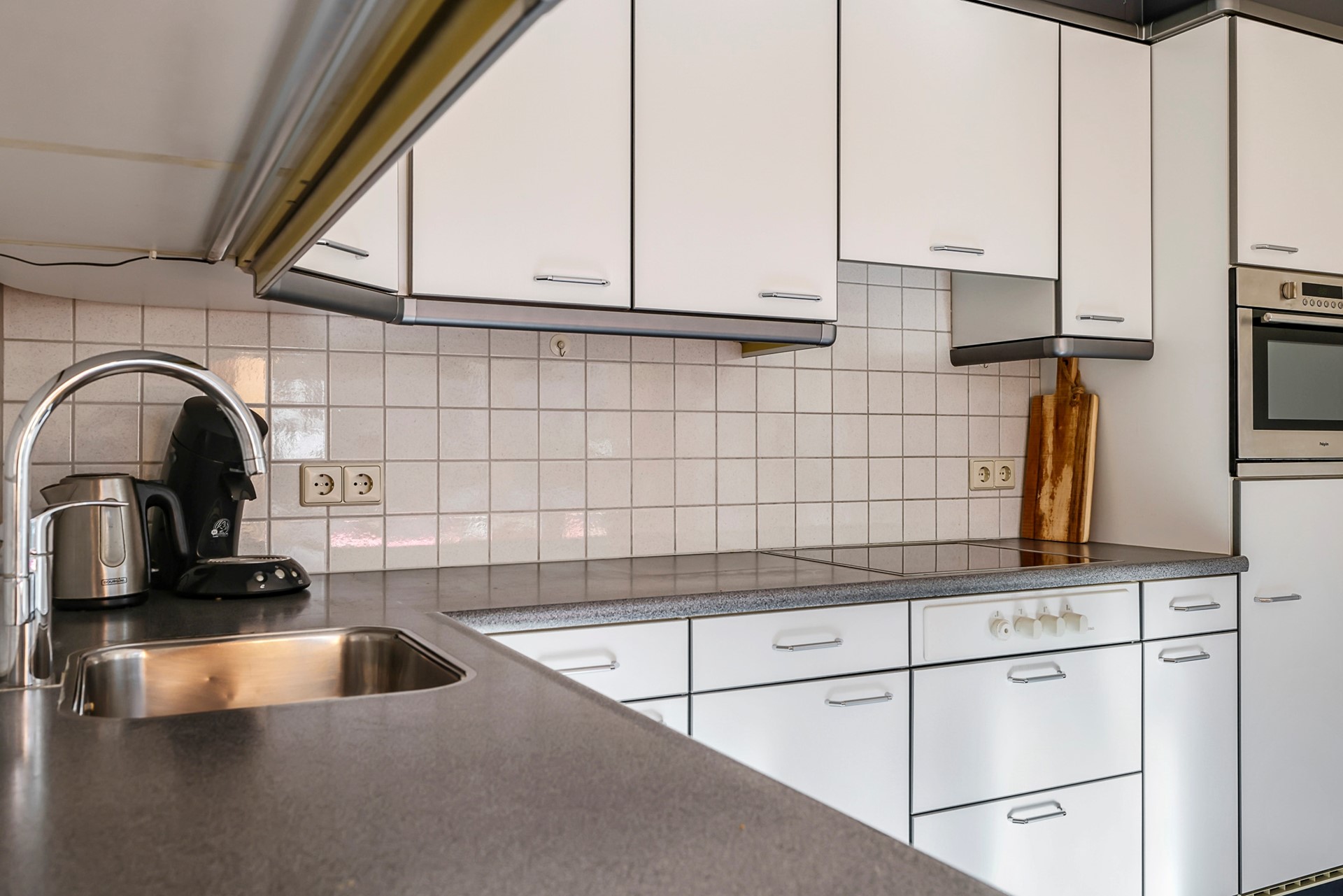 Aan de rechterzijde van de hal ligt de riante woon-eetkamer met dezelfde tegelvloer en grote raampartijen die zorgen voor een fijne lichtinval en een prachtig uitzicht op de groene tuin. Voor extra comfort beschikt de woonkamer over airconditioning. De aangrenzende keuken is uitgevoerd in een praktische witte hoekopstelling en is lekker ruim en licht. Vanuit de keuken is er toegang tot de bijkeuken, waar je aansluitingen vindt voor wasmachine en droger en volop bergruimte hebt. Vanuit de bijkeuken loop je zo de tuin in.