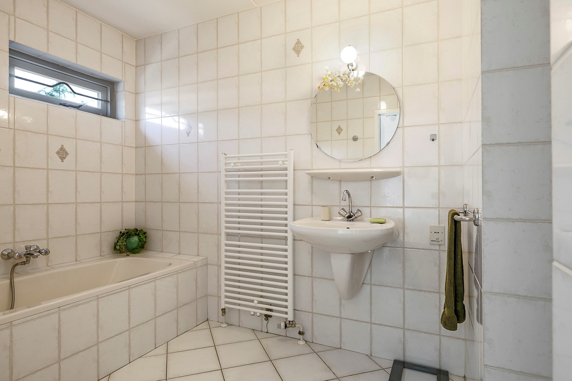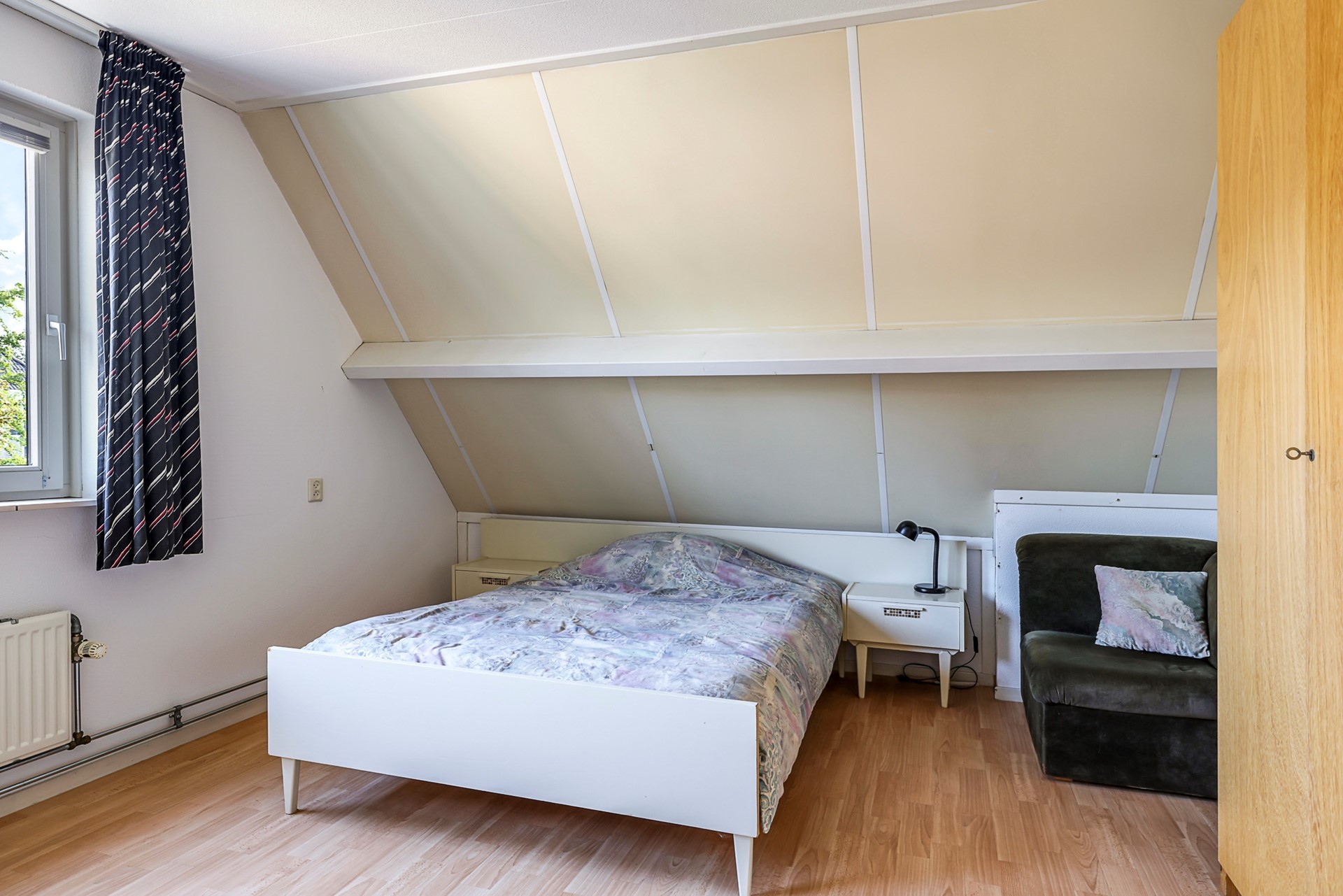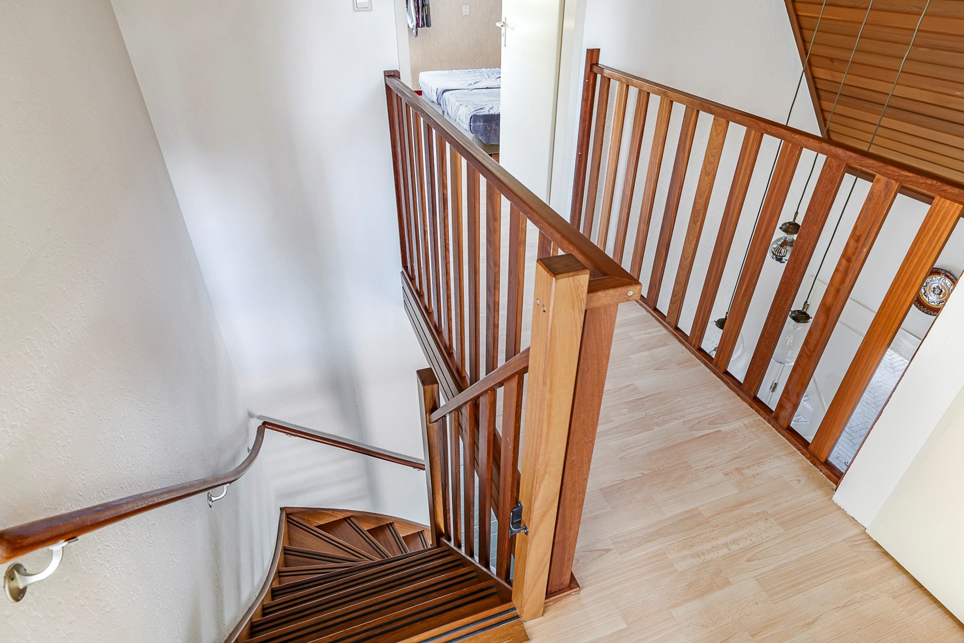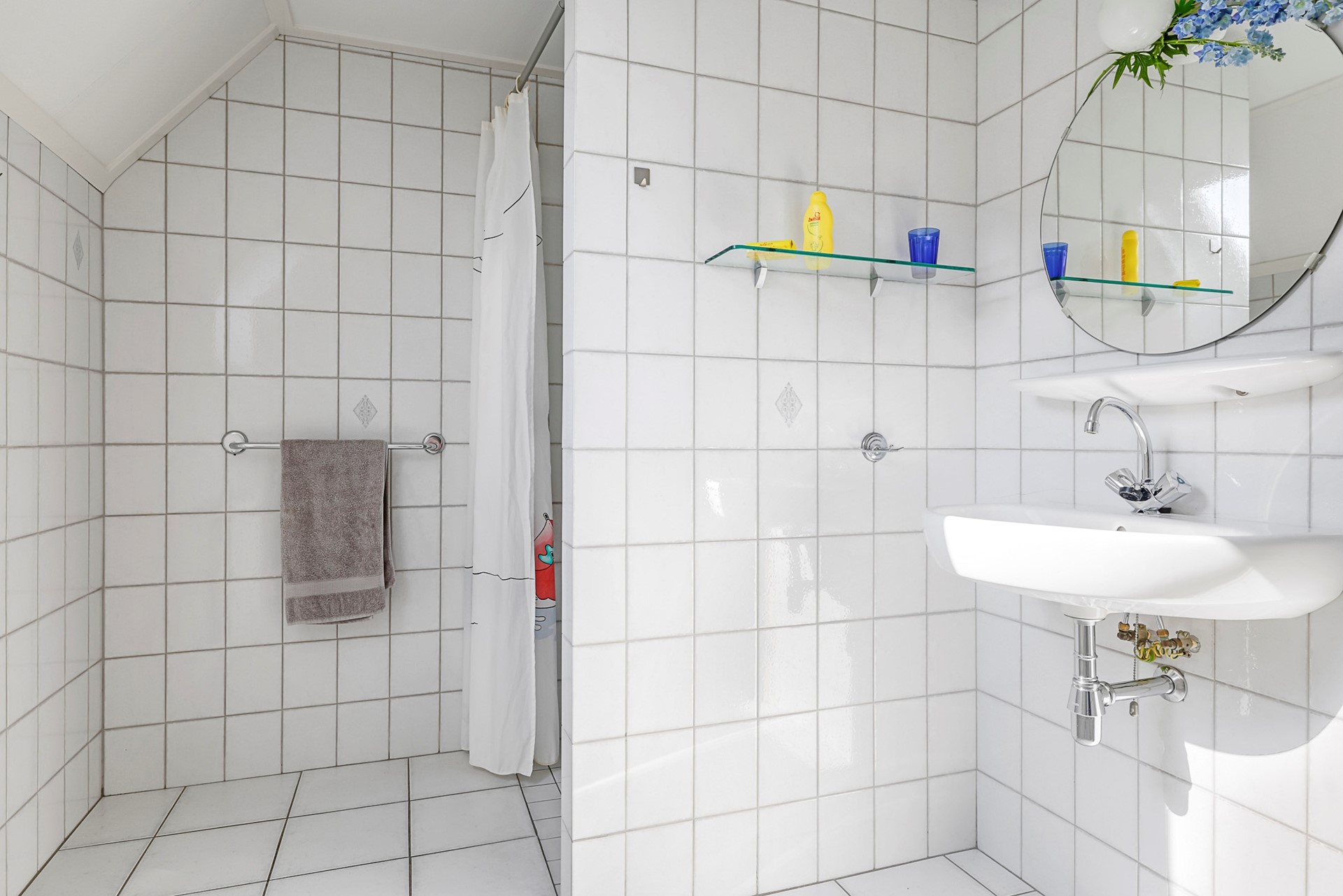 Boven kom je op een speelse vide die aansluit op de overloop. Vanaf hier heb je toegang tot drie slaapkamers en de tweede badkamer. Alles is netjes onderhouden, al kan een nieuwe eigenaar er natuurlijk voor kiezen om het geheel gemakkelijk een modernere uitstraling te geven. De master bedroom is bijzonder groot en biedt aanvullende mogelijkheden voor een werkplek, hobbyruimte of een ruim bemeten inloopkast. De andere twee slaapkamers zijn eveneens van prettig formaat. Vanuit één van deze kamers bereik je met een vlizotrap de zolder. De tweede badkamer van de woning is licht en neutraal, met een douche, wastafel en toilet.
